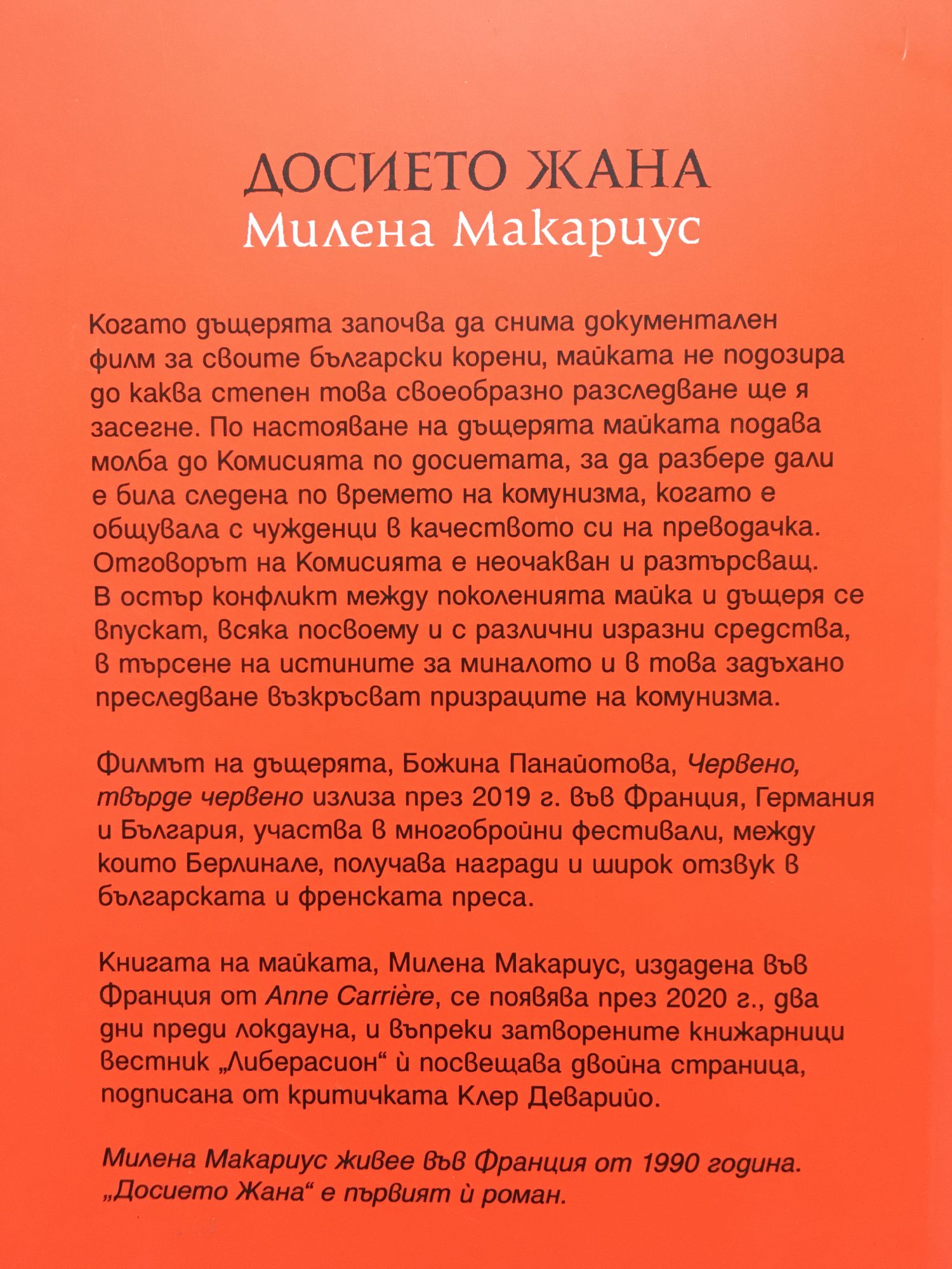 Когато дъщерята започва да снима документален филм за своите български корени, майката не подозира до каква степен това своеобразно разследване ще я засегне. По настояване на дъщерята майката подава молба до Комисията по досиетата, за да разбере дали е била следена по времето на комунизма, когато е общувала с чужденци в качеството си на преводачка. Отговорът на Комисията е неочакван и разтърсващ. В остър конфликт между поколенията майка и дъщеря се впускат, всяка посвоему и с различни изразни средства, в търсене на истините за миналото и в това задъхано преследване възкръсват призраците на комунизма. Филмът на дъщерята, Божина Панайотова, "Червено, твърде червено" излиза през 2019 г. във Франция, Германия и България, участва в многобройни фестивали, между които Берлинале, получава награди и широк отзвук в българската и френската преса. Книгата на майката, Милена Макариус, издадена във Франция от Anne Carrirre, се появява през 2020 г., два дни преди локдауна, и въпреки затворените книжарници вестник "Либерасион" ѝ посвещава двойна страница, подписана от критичката Клер Деварийо.
