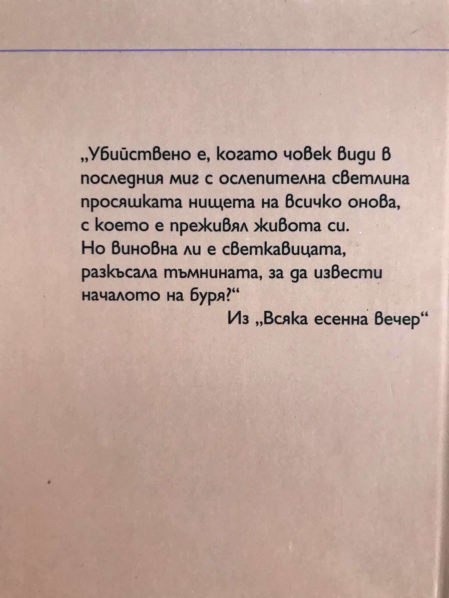 "Убийствено е, когато човек види в последния миг с ослепителна светлина просяшката нищета на всичко онова, с което е преживял живота си. Но виновна ли е светкавицата, разкъсала тъмнината, за да извести началото на буря?" Из "Всяка есенна вечер"