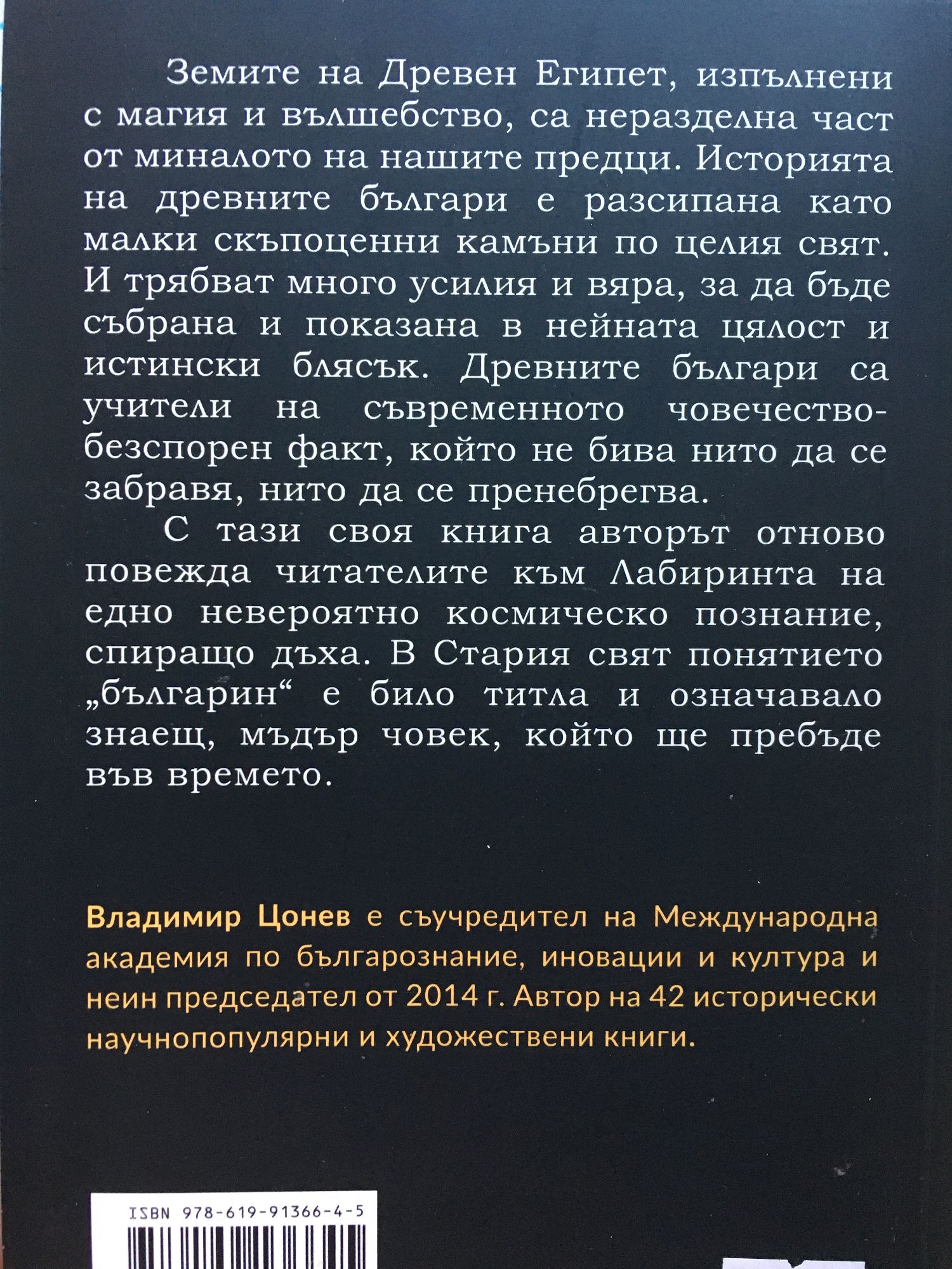 Земите на Древен Египет, изпълнени с магия и вълшебство, са неразделна част от миналото на нашите предци. Историята на древните българи е разписана като малки скъпоценни камъни по целия свят. И трябват много усилия и вяра, за да бъде събрана и показана в нейната цялост и истински блясък. Древните българи са учители на съвременното човечество - безспорен факт, който не бива нито да се забравя, нито да се пренебрегва. С тази своя книга авторът отново повежда читателите към Лабиринта на едно невероятно космическо познание, спиращо дъха. В Стария свят понятието българин е било титла и означавало знаещ, мъдър човек, който ще пребъде във времето. Владимир Цонев е съучредител на Международна академия по българознание, иновации и култура и неин председател от 2014 г. Автор е на 42 исторически научнопопулярни и художествени книги.