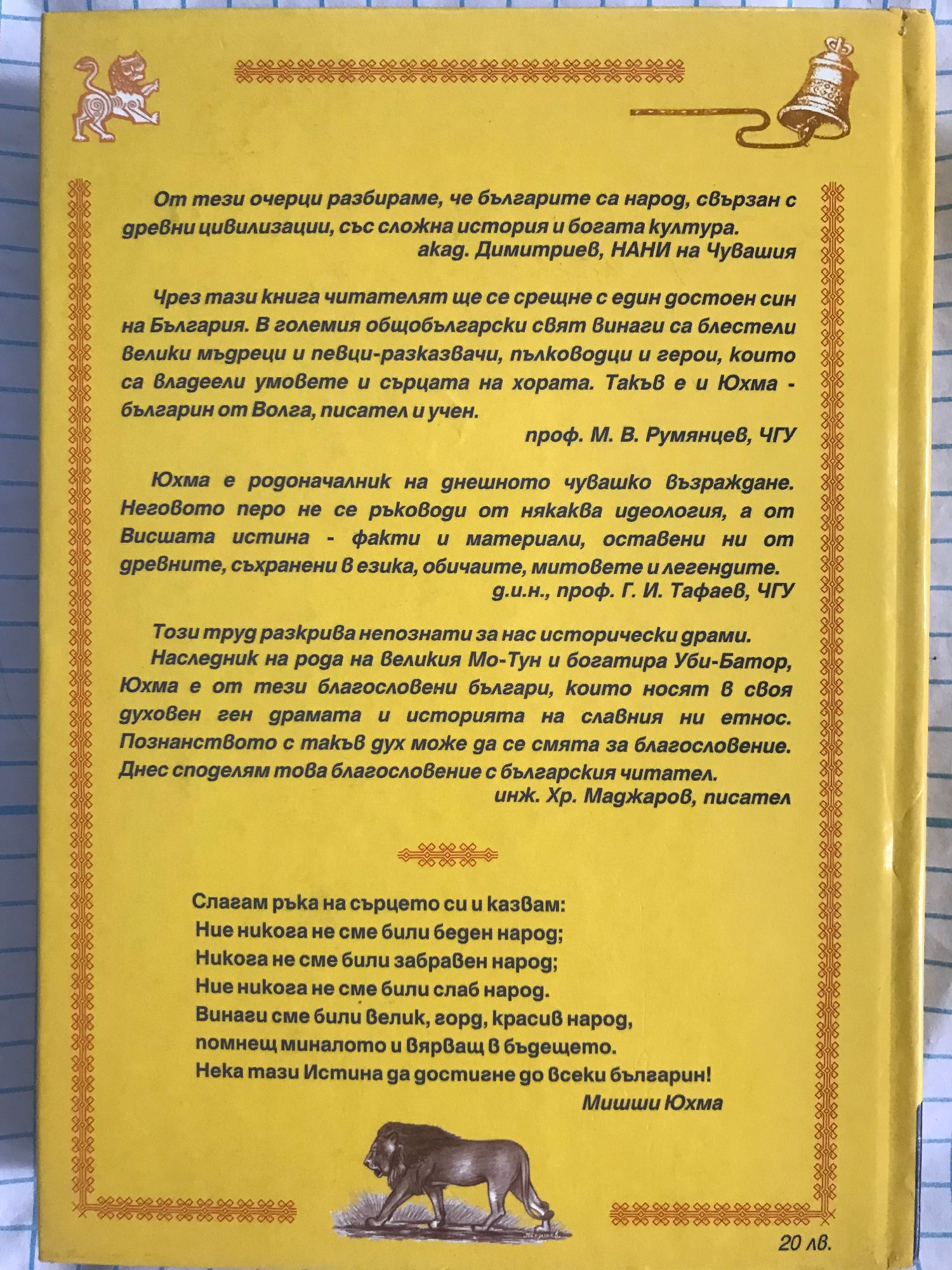 От тези очерци разбираме, че българите са народ, свързан с древни цивилизации, със сложна история и богата култура. акад. Димитриев, НАНИ на Чувашия Чрез тази книга читателят ще се срещне с един достоен син на България. В големия общобългарски свят винаги са блестели велики мъдреци и певци-разказвачи, пълководци и герои, които са владеели умовете и сърцата на хората. Такъв е и Юхма - българин от Волга, писател и учен. проф. М. В. Румянцев, ЧГУ Юхма е родоначалник на днешното чувашко възраждане. Неговото перо не се ръководи от някаква идеология, а от Висшата истина - факти и материали, оставени ни от древните, съхранени в езика, обичаите, митовете и легендите. д.и.н., проф. Г. И. Тафаев, ЧГУ Този труд разкрива непознати за нас исторически драми. Наследник на рода на великия Мо-Тун и богатира Уби-Батор, Юхма е от тези благословени българи, които носят в своя духовен ген драмата и историята на славния ни етнос. Познанството с такъв дух може да се смята за благословение. Днес споделям това благословение с българския читател. инж. Хр. Маджаров, писател