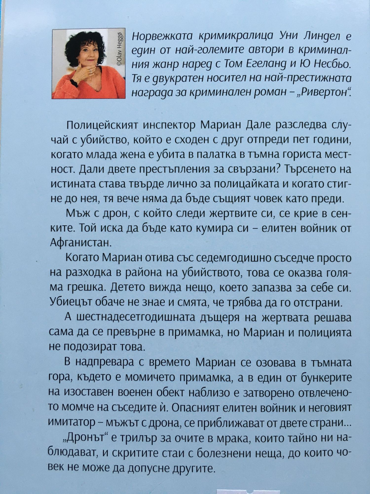 Полицейският инспектор Мариан Дале разследва случай с убийство, който е сходен с друг отпреди пет години, когато млада жена е убита в палатка в тъмна гориста местност. Дали двете престъпления за свързани? Търсенето на истината става твърде лично за полицайката и когато стигне до нея, тя вече няма да бъде същият човек като преди. Мъж с дрон, с който следи жертвите си, се крие в сенките. Той иска да бъде като кумира си - елитен войник от Афганистан. Когато Мариан отива със седемгодишно съседче просто на разходка в района на убийството, това се оказва голяма грешка. Детето вижда нещо, което запазва за себе си. Убиецът обаче не знае и смята, че трябва да го отстрани. А шестнадесетгодишната дъщеря на жертвата решава сама да се превърне в примамка, но Мариан и полицията не подозират това. В надпревара с времето Мариан се озовава в тъмната гора, където е момичето примамка, а в един от бункерите на изоставен военен обект наблизо е затворено отвлеченото момче на съседите ѝ. Опасният елитен войник и неговият имитатор - мъжът с дрона, се приближават от двете страни... Дронът е трилър за очите в мрака, които тайно ни наблюдават, и скритите стаи с болезнени неща, до които човек не може да допусне другите. Норвежката кримикралица Уни Линдел е един от най-големите автори в криминалния жанр наред с Том Егеланд и Ю Несбьо. Тя е двукратен носител на най-престижната награда за криминален роман - Ривертон.