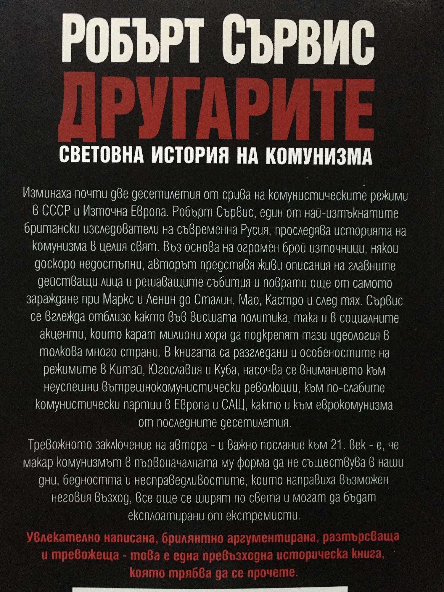 Изминаха почти две десетилетия от срива на комунистическите режими в СССР и Източна Европа. Робърт Сървис, един от най-изтъкнатите британски изследователи на съвременна Русия, проследява историята на комунизма в целия свят. Въз основа на огромен брой източници, някои доскоро недостъпни, авторът представя живи описания на главните действащи лица и решаващите събития и поврати още от самото зараждане при Маркс и Ленин до Сталин, Мао, Кастро и след тях. Сървис се вглежда отблизо както във висшата политика, така и в социалните акценти, които карат милиони хора да подкрепят тази идеология в толкова много страни. В книгата са разгледани и особеностите на режимите в Китай, Югославия и Куба, насочва се вниманието към неуспешни вътрешнокомунистически революции, към по-слабите комунистически партии в Европа и САЩ, както и към еврокомунизма от последните десетилетия. Тревожното заключение на автора – и важно послание към 21. век – е, че макар комунизмът в първоначалната му форма да не съществува в наши дни, бедността и несправедливостите, които направиха възможен неговия възход, все още се ширят по света и могат да бъдат експлоатирани от екстремисти. Увлекателно написана, брилянтно аргументирана, разтърсваща и тревожеща - това е една превъзходна историческа книга, която трябва да се прочете.