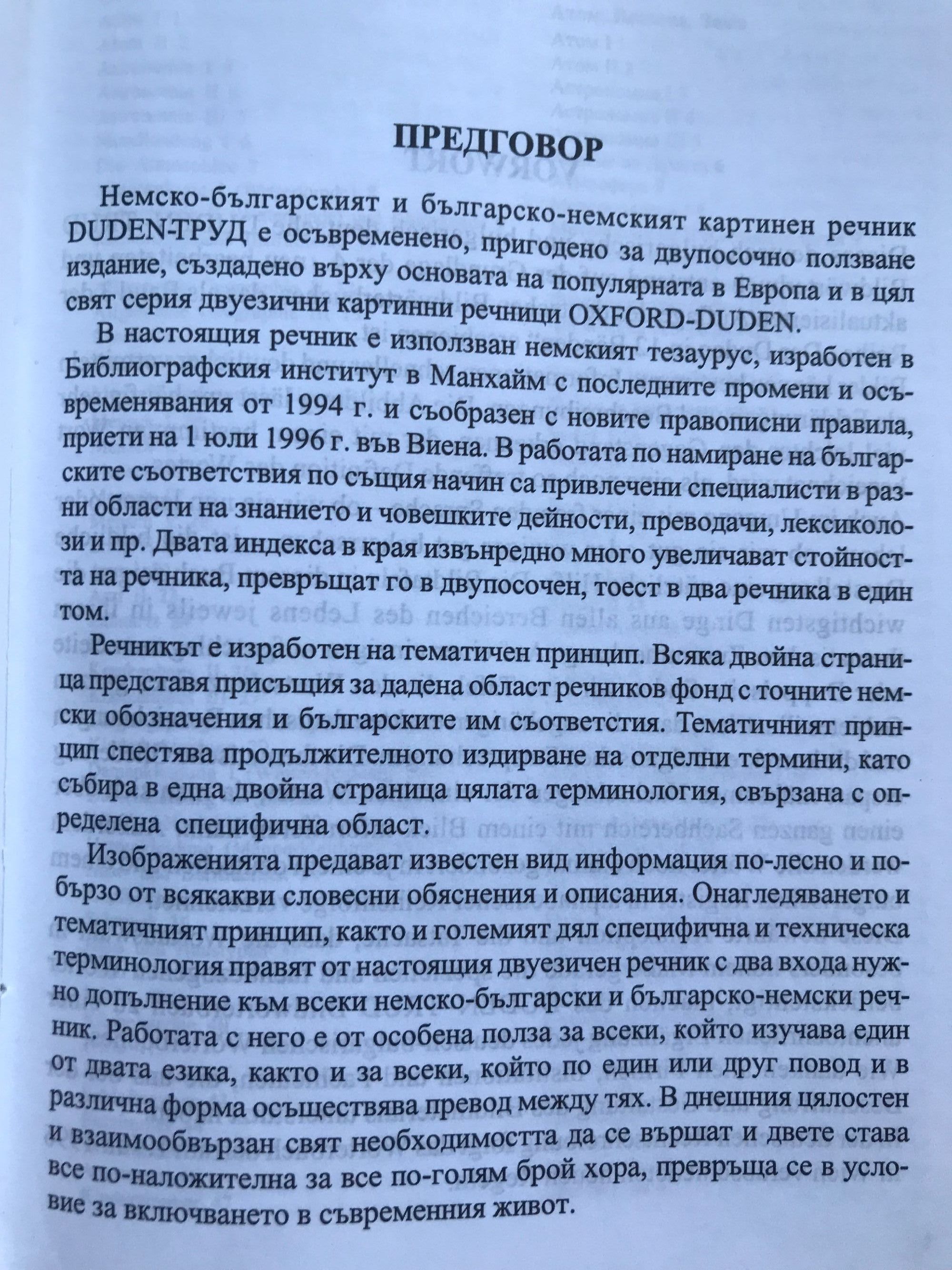 Немско-българският и българско-немският картинен речник DUDEN-ТРУД е осъвременено, пригодено за двупосочно ползване издание, създадено върху основата на популярната в Европа и в цял свят серия двуезични картинни речници OXFORD-DUDEN. В настоящия речник е използван немският тезаурус, изработен в Библиографския институт в Манхайм с последните промени и осъвременявания от 1994 г. и съобразен с новите правописни правила, приети на 1 юли 1996 г. във Виена. В работата по намиране на българските съответствия по същия начин са привлечени специалисти в разни области на знанието и човешките дейности, преводачи, лексиколози и пр. Двата индекса в края извънредно много увеличават стойността на речника, превръщат го в двупосочен, тоест в два речника в един том. Речникът е изработен на тематичен принцип. Всяка двойна страница представя присъщия за дадена област речников фонд с точните немски обозначения и българските им съответствия Тематичният принцип спестява продължителното издирване на отделни термини, като събира в една двойна страница цялата терминология, свързана с определена специфична област. Изображенията предават известен вид информация по-лесно и по-бързо от всякакви словесни обяснения и описания. Онагледяването и тематичният принцип, както и големият дял специфична и техническа терминология правят от настоящия двуезичен речник с два входа нужно допълнение към всеки немско-български и българско-немски речник. Работата с него е от особена полза за всеки, който изучава един от двата езика, както и за всеки, който по един или друг повод и в различна форма осъществява превод между тях. В днешния цялостен и взаимообвързан свят необходимостта да се вършат и двете става все по-наложителна за все по-голям брой хора, превръща се в условие за включването в съвременния живот.