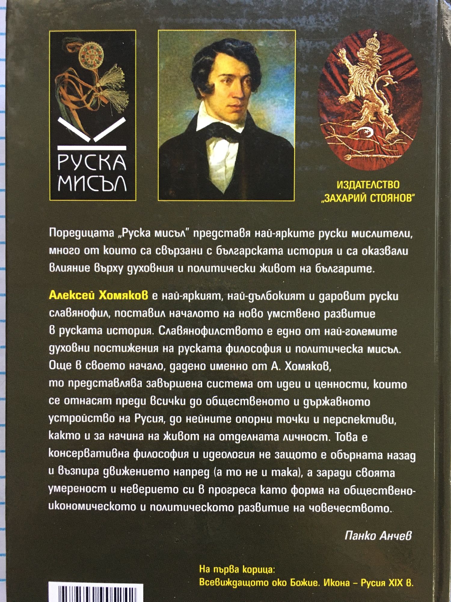 Поредицата „Руска мисъл" представя най-ярките руски мислители, много от които са свързани с българската история и са оказвали влияние върху духовния и политически живот на българите. Алексей Хомяков е най-яркият, най-дълбокият и даровит руски славянофил, поставил началото на ново умствено развитие в руската история. Славянофилството е едно от най-големите духовни постижения на руската философия и политическа мисъл. Още в своето начало, дадено именно от А. Хомяков, то представлява завършена система от идеи и ценности, които се отнасят преди всички до общественото и държавното устройство на Русия, до нейните опорни точки и перспективи, както и за начина на живот на отделната личност. Това е консервативна философия и идеология не защото е обърната назад и възпира движението напред (а то не и така), а заради своята умереност и неверието си в прогреса като форма на обществено-икономическото и политическото развитие на човечеството.