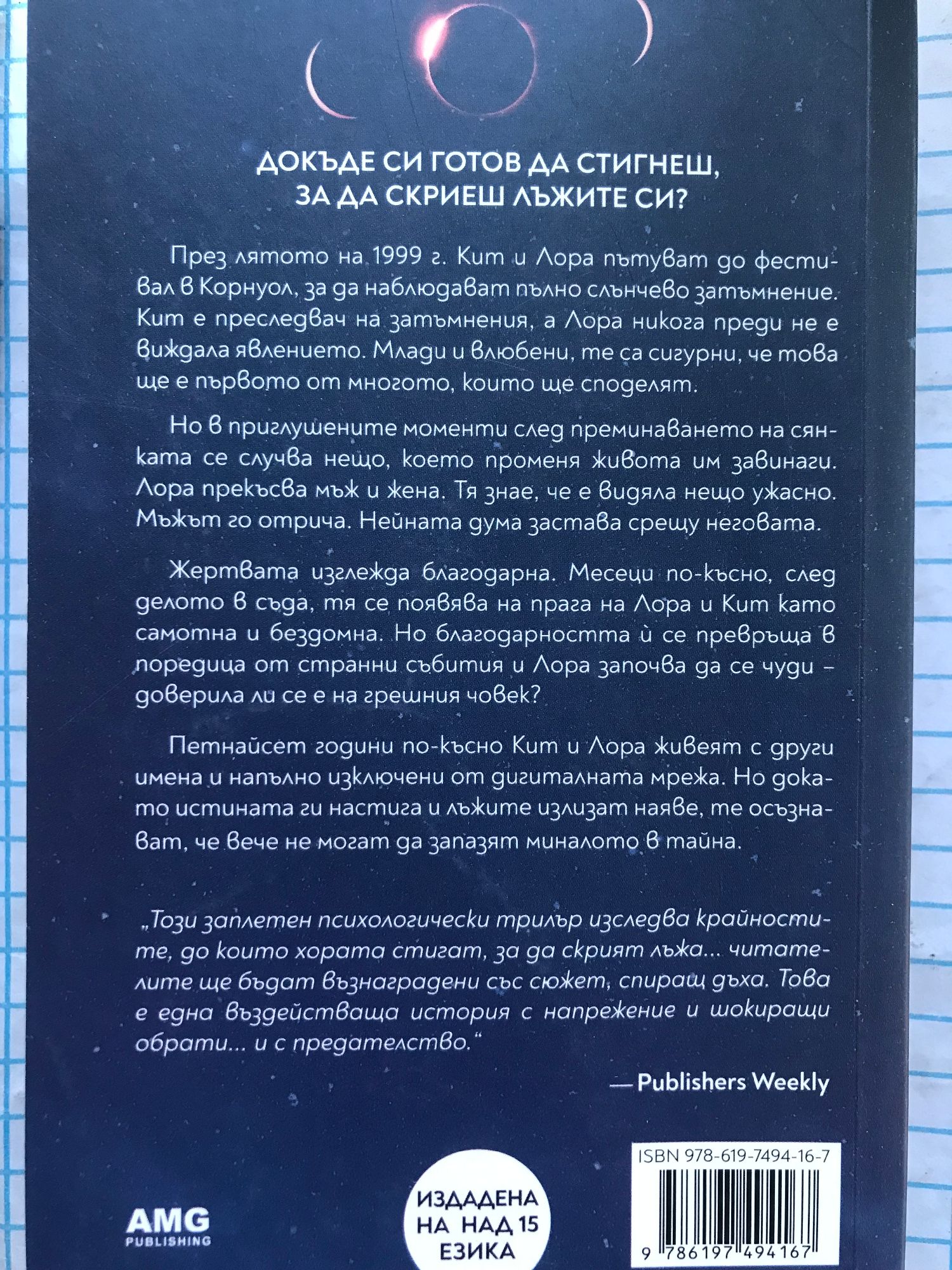 През лятото на 1999 г. Кит и Лора пътуват до фестивал в Корнуол, за да наблюдават пълно слънчево затъмнение. Кит е преследвач на затъмнения, а Лора никога преди не е виждала явлението. Млади и влюбени, те са сигурни, че това ще е първото от многото, които ще споделят. Но в приглушените моменти след преминаването на сянката се случва нещо, което променя живота им завинаги. Лора прекъсва мъж и жена. Тя знае, че е видяла нещо ужасно. Мъжът го отрича. Нейната дума застава срещу неговата. Жертвата изглежда благодарна. Месеци по-късно, след делото в съда, тя се появява на прага на Лора и Кит като самотна и бездомна. Но благодарността й се превръща в поредица от странни събития и Лора започва да се чуди – доверила ли се е на грешния човек? Петнайсет години по-късно Кит и Лора живеят с други имена и напълно изключени от дигиталната мрежа. Но докато истината ги настига и лъжите излизат наяве, те осъзнават, че вече не могат да запазят миналото в тайна. „Този заплетен психологически трилър изследва крайностите, до които хората стигат, за да скрият лъжа... читателите ще бъдат възнаградени със сюжет, спиращ дъха. Това е една въздействаща история с напрежение и шокиращи обрати... и с предателство.“ Publishers Weekly