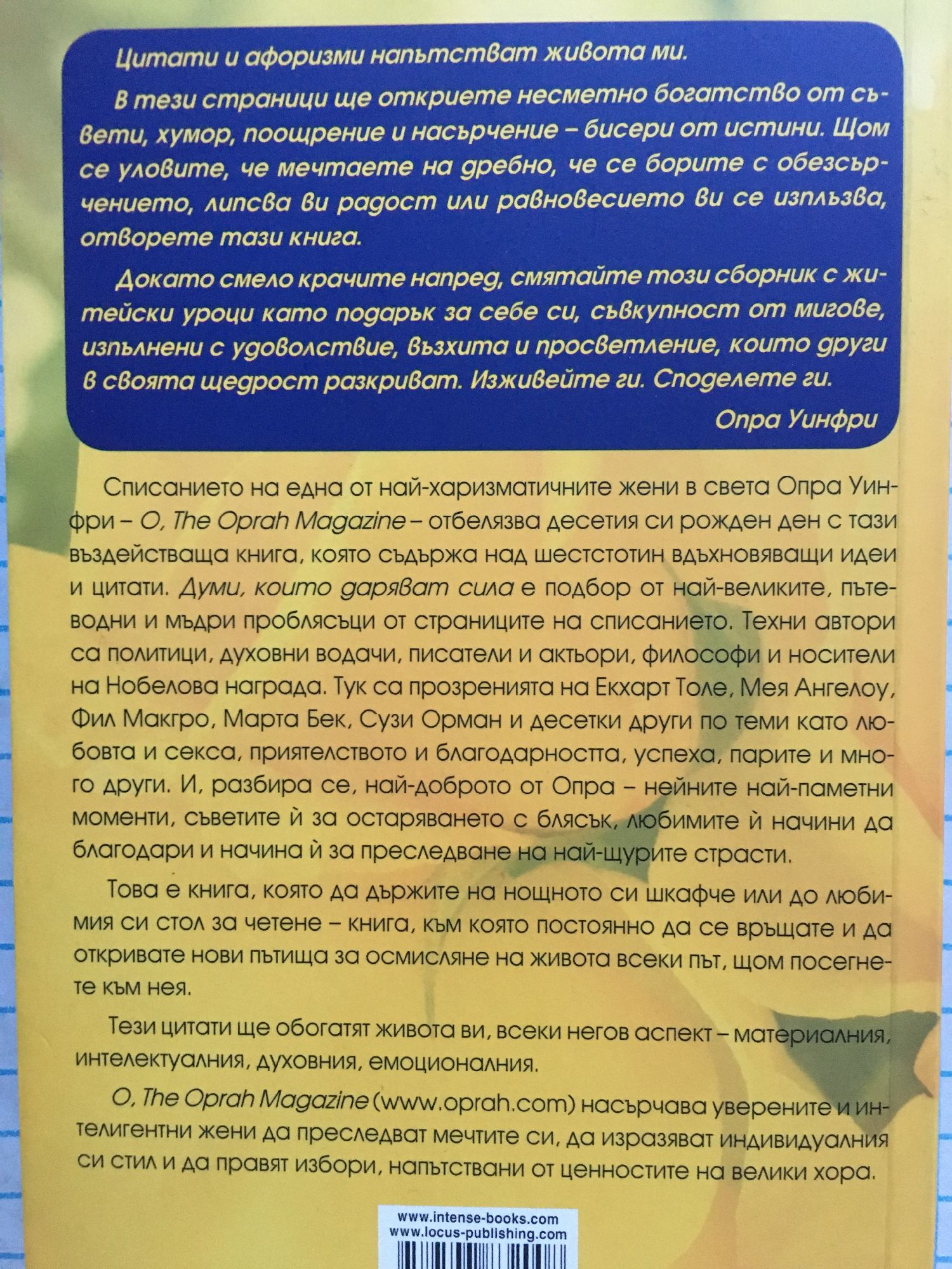 Списанието на една от най - харизматичните жени в света Опра Уинфри отбелязва десетия си рожден ден с тази въздействаща книга, която съдържа над шестстотин вдъхновяващи идеи и цитати. "Думи, които даряват сила" е подбор от най-великите, пътеводни и мъдри проблясъци от страниците на списанието. Техни автори са политици, духовни водачи, писатели и актьори, философи и носители на Нобелова награда. Тук са прозренията на Екхарт Толе, Мея Ангелоу, Фил Макгро, Марта Бек, Сузи Орман и десетки други по теми като любовта, секса, приятелството и благодарността, успеха, парите и много други. И, разбира се, най-доброто от Опра - нейните най-паметни моменти, съветите ѝ за остаряването с блясък, любимите ѝ начини да благодари и начина ѝ за преследване на най-щурите страсти. "Цитати и афоризми напътстват живота ми. В тези страници ще откриете несметно богатство от съвети, хумор, поощрение и насърчение - бисери от истини. Щом се уловите, че мечтаете на дребно, че се борите с обезсърчението, липсва ви радост или равновесието ви се изплъзва, отворете тази книга. Докато смело крачите напред, смятайте този сборник с житейски уроци като подарък за себе си, съвкупност от мигове, изпълнени с удоволствие, възхита и просветление, които други в своята щедрост разкриват. Изживейте ги. Споделете ги." Опра Уинфри