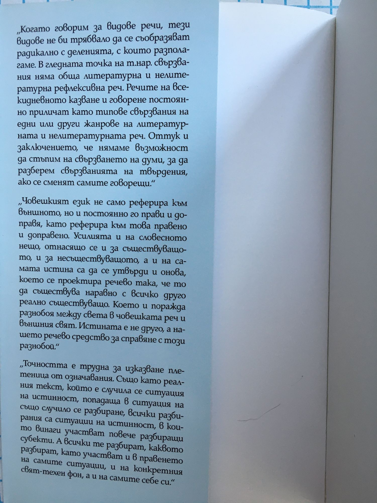 „Когато говорим 3а видове речи, тези видове не би трябвало да се съобразяват радикално с деленията, с които разполагаме. В гледната точка на т.нар. свързвания няма обща литературна и нелитературна рефлексивна реч. Речите на всекидневното казване и говорене постоянно приличат като типове свързвания на едни или други жанрове на литературната и нелитературната реч. Оттук и Заключението, че нямаме възможност да стъпим на свързването на думи, 3а да разберем свързванията на твърдения, ако се сменят самите говорещи/' „Човешкият език не само реферира към външното, но и постоянно го прави и до-правя, като реферира към това правено и доправено. Усилията и на словесното нещо, отнасящо се и 3а съществуващото, и 3а несъществуващото, а и на самата истина са да се утвърди и онова, което се проектира речево така, че то да съществува наравно с всичко друго реално съществуващо. Което и поражда разнобоя между света в човешката реч и външния свят. Истината е не друго, а нашето речево средство 3а справяне с този разнобой/' „Точността е трудна 3а изказване плетеница от означавания. Също като реалния текст, който е случила се ситуация на истинност, попадаща в ситуация на също случило се разбиране, всички разбирания са ситуации на истинност, в които винаги участват повече разбиращи субекти. А всички те разбират, каквото разбират, като участват и в правенето на самите ситуации, и на конкретния свят-техен фон, а и на самите себе си".