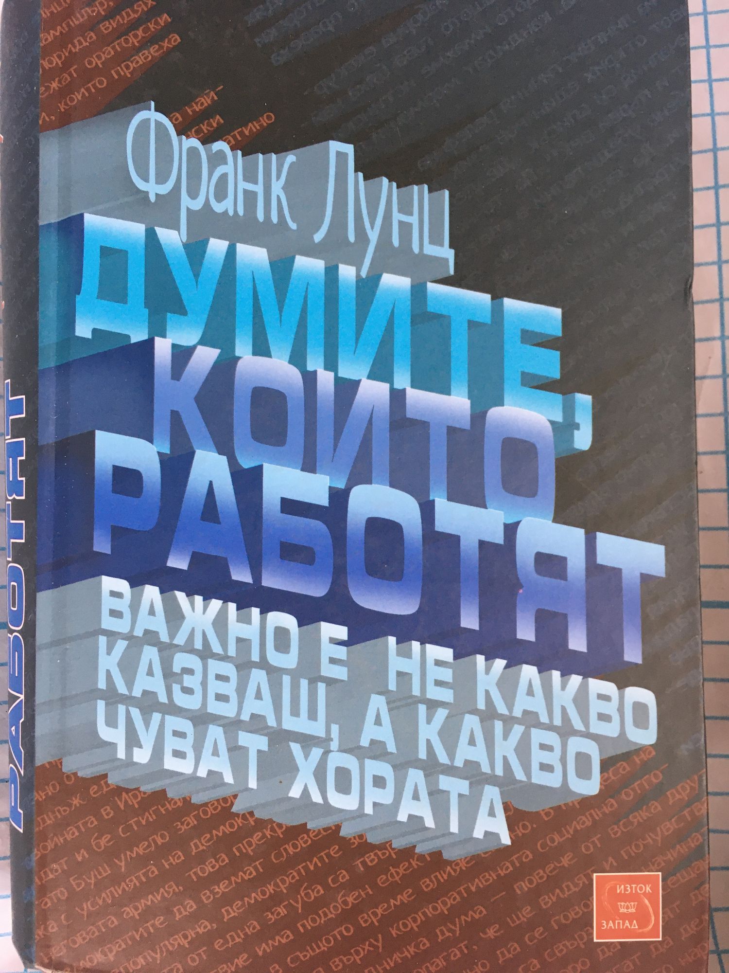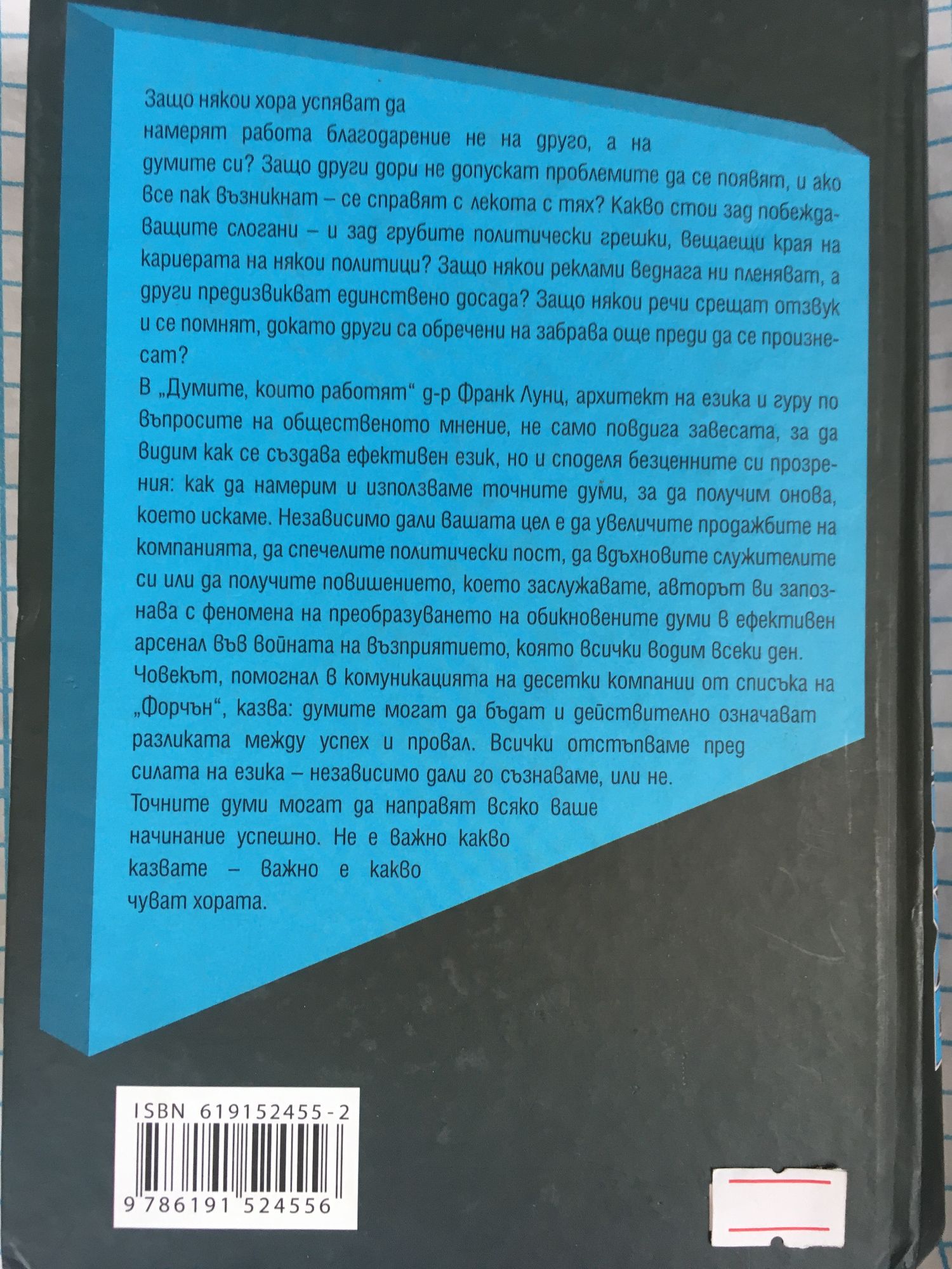 Защо някои хора успяват да намерят работа благодарение не на друго, а на думите си? Защо други дори не допускат проблемите да се появят, и ако все пак възникнат - се справят с лекота с тях? Какво стои зад побеждаващите слогани - и зад грубите политически грешки, вещаещи края на кариерата на някои политици? Защо някои реклами веднага ни пленяват, а други предизвикват единствено досада? Защо някои речи срещат отзвук и се помнят, докато други са обречени на забрава още преди да се произнесат? В "Думите, които работят", д-р Франк Лунц, архитект на езика и гуру по въпросите на общественото мнение, не само повдига завесата, за да видим как се създава ефективен език, но и споделя безценните си прозрения: как да намерим и използваме точните думи, за да получим онова, което искаме. Независимо дали вашата цел е да увеличите продажбите на компанията, да спечелите политически пост, да вдъхновите служителите си или да получите повишението, което заслужавате, авторът ви запознава с феномена на преобразуването на обикновените думи в ефективен арсенал във войната на възприятието, която всички водим всеки ден. Човекът, помогнал в комуникацията на десетки компании от списъка на "Форчън", казва: "Думите могат да бъдат и действително означават разликата между успех и провал. Всички отстъпваме пред силата на езика - независимо дали го съзнаваме, или не!". Точните думи могат да направят всяко ваше начинание успешно. Не е важно какво казвате - важно е какво чуват хората!