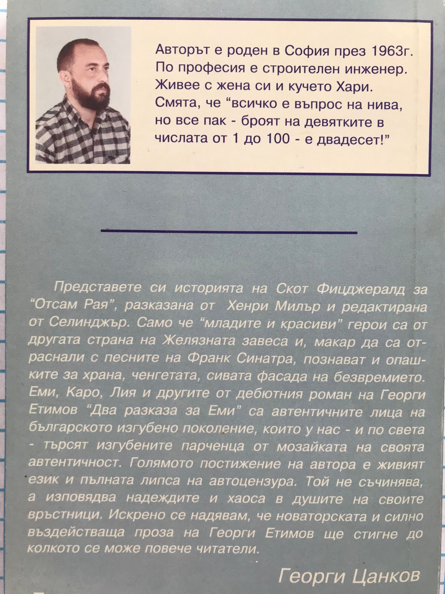 "Представете си историята на Скот Фицджералд за "Отсам рая", разказана от Хенри Милър и редактирана от Селинджър. Само че "младите и красиви" герои са от другата страна на Желязната завеса и, макар да са отраснали с песните на Франк Синатра, познават и опашките за храна, ченгетата, сивата фасада на безвремието. Еми, Каро, Лия и другите от дебютния роман на Георги Етимов "Два разказа за Еми" са автентичните лица на българското изгубено поколение, които у нас - и по света - търсят изгубените парченца от мозайката на своята автентичност. Голямото постижение на автора е живият език и пълната липса на автоцензура. Той не съчинява, а изповядва надеждите и хаоса в душите на своите връстници. Искрено се надявам, че новаторската и силно въздействаща проза на Георги Етимов ще стигне до колкото се може повече читатели." (Георги Цанков)