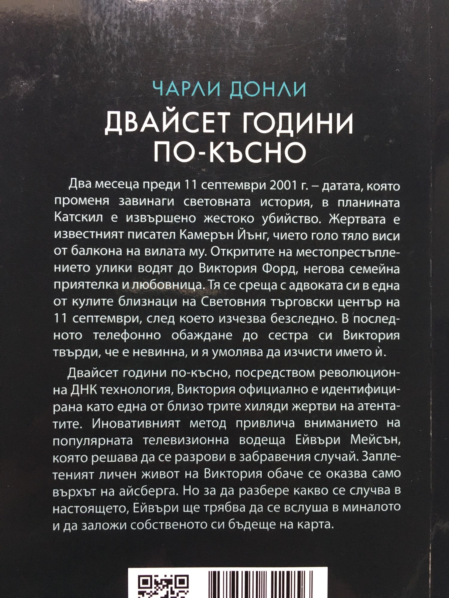 „Двайсет години по-късно“ е заплетена и интригуваща история за жестоко убийство и тъмни тайни, за които е време да излязат наяве. Два месеца преди 11 септември 2001 г. – датата, която променя завинаги световната история, в планината Катскил е извършено жестоко убийство. Жертвата е известният писател Камерън Йънг, чието голо тяло виси от балкона на вилата му. Откритите на местопрестъплението улики водят до Виктория Форд, негова семейна приятелка и любовница. Тя се среща с адвоката си в една от кулите близнаци на Световния търговски център на 11 септември, след което изчезва безследно. В последното телефонно обаждане до сестра си Виктория твърди, че е невинна, и я умолява да изчисти името й. Двайсет години по-късно, посредством революционна ДНК технология, Виктория официално е идентифицирана като една от близо трите хиляди жертви на атентатите. Иновативният метод привлича вниманието на популярната телевизионна водеща Ейвъри Мейсън, която решава да се разрови в забравения случай. Заплетеният личен живот на Виктория обаче се оказва само върхът на айсберга. Но за да разбере какво се случва в настоящето, Ейвъри ще трябва да се вслуша в миналото и да заложи собственото си бъдеще на карта.