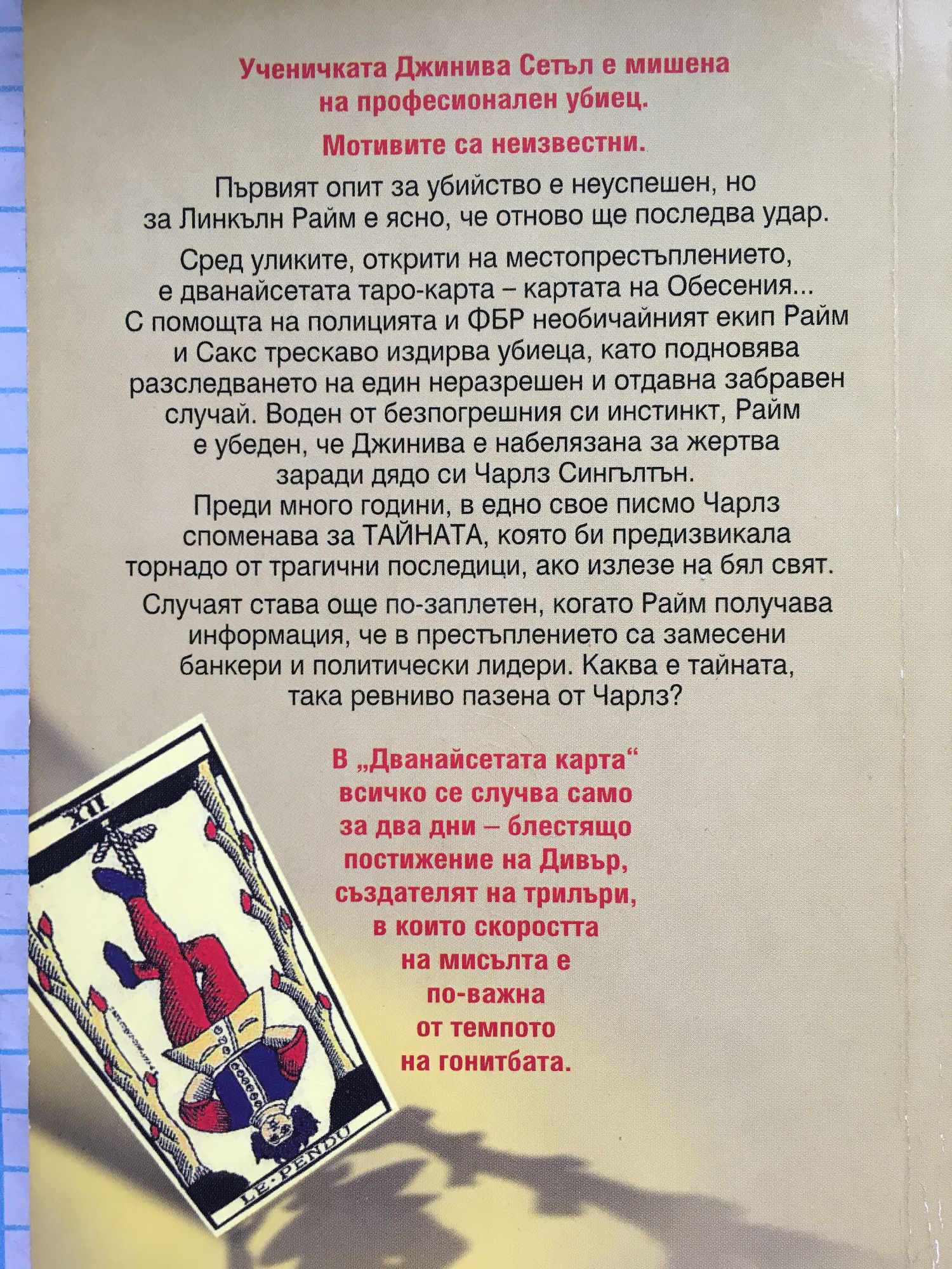 Ученичката Джинива Сетъл е мишена на професионален убиец. Мотивите са неизвестни. Първият опит за убийство е неуспешен, но за Линкълн Райм е ясно, че отново ще последва удар. Сред уликите, открити на местопрестъплението, е дванайсeтата таро-карта - картата на Обесения... С помощта на полицията и ФБР необичайният екип Райм и Сакс трескаво издирва убиеца, като подновява разследването на един неразрешен и отдавна забравен случай. Воден от безпогрешния си инстинкт, Райм е убеден, че Джинива е набелязана за жертва заради дядо си Чарлз Сингълтън. Преди много години, в едно свое писмо Чарлз споменава за ТАЙНАТА, която би предизвикала торнадо от трагични последици, ако излезе на бял свят. Случаят става още по-заплетен, когато Райм получава информация, че в престъплението са замесени банкери и политически лидери. Каква е тайната, така ревниво пазена от Чарлз? В "Дванайсетата карта" всичко се случва само за два дни - блестящо постижение на Дивър, създателят на трилъри, в които скоростта на мисълта е по-важна от темпото на гонитбата.