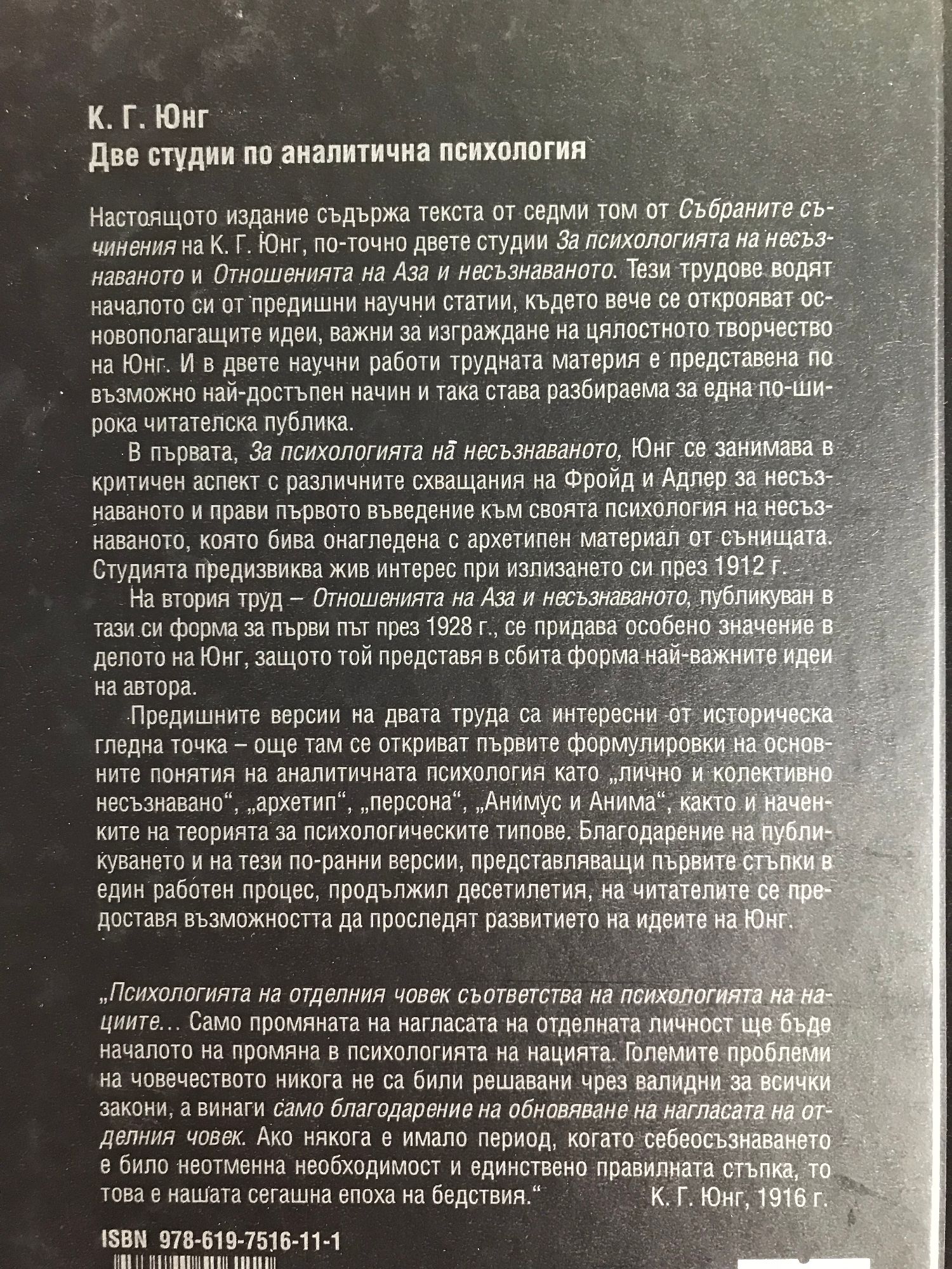 Настоящото издание съдържа текста от седми том от Събраните съчинения на К. Г. Юнг, по-точно двете студии "За психологията на несъзнаваното" и "Отношенията на Аз-а и несъзнаваното". Тези трудове водят началото си от предишни научни статии, където вече се открояват основополагащите идеи, важни за изграждане на цялостното творчество на Юнг. И в двете научни работи трудната материя е представена по възможно най-достъпен начин и така става рабираема за една по-широка читателска публика.
