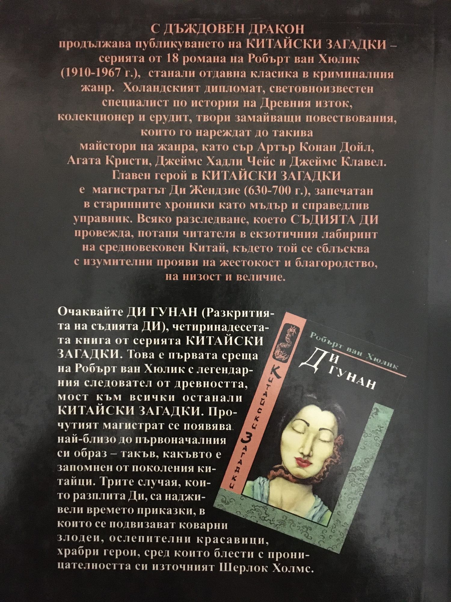 С "Дъждовен дракон" продължава публикуването на "Китайски загадки" - серията от 18 романа на Робърт ван Хюлик (1910-1967 г.), станали отдавна класика в криминалния жанр. Главен герой в "Китайски загадки" е магистратът Ди Жендзие (630-700 г.), запечатан в старинните хроники като мъдър и справедлив управник. Всяко разследване, което съдията Ди провежда, потапя читателя в екзотичния лабиринт на средновековен Китай, където той се сблъсква с изумителни прояви на жестокост и благородство, на низост и величие.