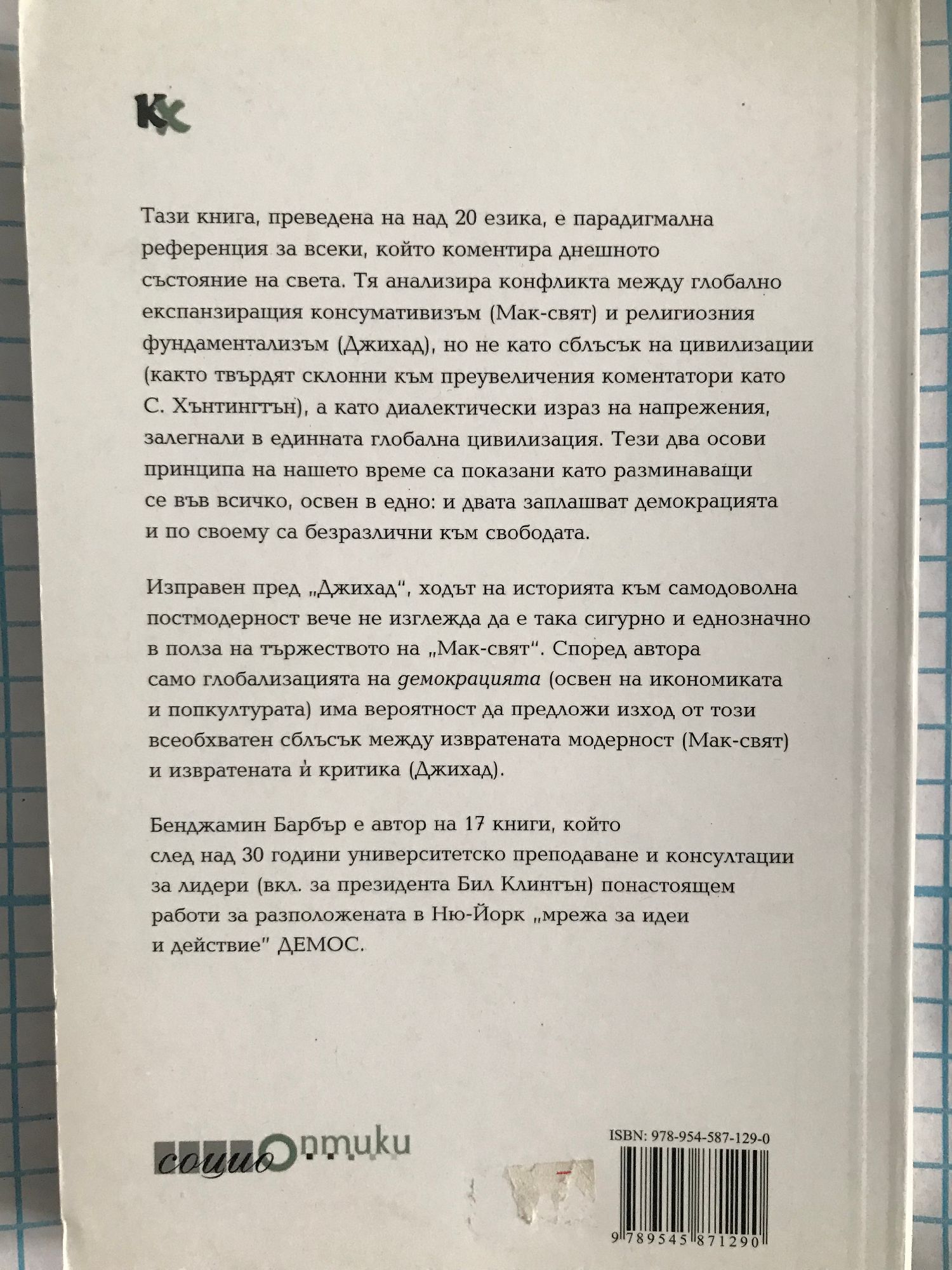 Тази книга, преведена на над 20 езика, е парадигмална референция за всеки, който коментира днешното състояние на света. Тя анализира конфликта между глобално експанзиращия консумативизъм (Мак-свят) и религиозния фундаментализъм (Джихад), но не като сблъсък на цивилизации (както твърдят склонни към преувеличения коментатори като С. Хънтингтън), а като диалектически израз на напрежения, залегнали в единната глобална цивилизация. Тези два осовни принципа на нашето време са показани като разминаващи се във всичко, освен в едно: и двата заплашват демокрацията и по своему са безразлични към свободата. Изправен пред „Джихад", ходът на историята към самодоволна постмодерност вече не изглежда да е така сигурно и еднозначно в полза на тържеството на „Мак-свят". Според автора само глобализацията на демокрацията (освен на икономиката и попкултурата) има вероятност да предложи изход от този всеобхватен сблъсък между извратената модерност (Мак-свят) и извратената й критика (Джихад). Бенджамин Барбър е автор на 17 книги, който след над 30 години университетско преподаване и консултации за лидери (вкл. за президента Бил Клинтън) понастоящем работи за разположената в Ню-Йорк „мрежа за идеи и действие" ДЕМОС.