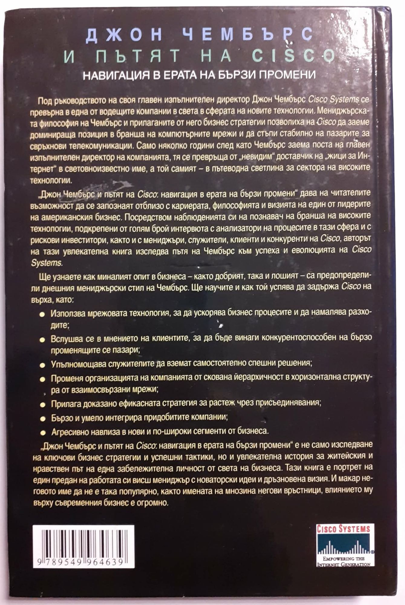 Под ръководството на своя главен изпълнителен директор Джон Чембърс Cisco Systems се превърна в една от водещите компании в света в сферата на новите технологии. Мениджърската философия на Чембърс и прилаганите от него бизнес стратегии позволиха на Cisco да заеме доминираща позиция в бранша на компютърните мрежи и да стъпи стабилно на пазарите за свръхнови телекомуникации. Само няколко години след като Чембърс заема поста на главен изпълнителен директор на компанията, тя се превръща от "невидим" доставчик на "жици за Интернет" в световноизвестно име, а той самият - в пътеводна светлина за сектора на високите технологии. "Джон Чембърс и пътят на Cisco: навигация в ерата на бързи промени" дава на читателите възможност да се запознаят отблизо с кариерата, философията и визията на един от лидерите на американския бизнес. Посредством наблюденията си на познавач на бранша на високите технологии, подкрепени от голям брой интервюта с анализатори на процесите в тази сфера и с рискови инвеститори, както и с мениджъри, служители, клиенти и конкуренти на Cisco, авторът на тази увлекателна книга изследва пътя на Чембърс към успеха и еволюцията на Cisco Systems. Ще узнаете как миналият опит в бизнеса - както добрият, така и лошият - са предопределили днешния мениджърски стил на Чембьрс. Ще научите и как той успява да задържа Cisco на върха, като: Използва мрежовата технология, за да ускорява бизнес процесите и да намалява разходите; Вслушва се в мнението на клиентите, за да бъде винаги конкурентоспособен на бързо променящите се пазари; Упълномощава служителите да вземат самостоятелно спешни решения; Променя организацията на компанията от скована йерархичност в хоризонтална структура от взаимосвързани мрежи; Прилага доказано ефикасната стратегия за растеж чрез присъединявания; Бързо и умело интегрира придобитите компании; Агресивно навлиза в нови и по-широки сегменти от бизнеса. Книгата е не само изследване на ключови бизнес стратегии и успешни тактики, но и увлекателна история за житейския и нравствен път на една забележителна личност от света на бизнеса. Тази книга е портрет на един предан на работата си висш мениджър с новаторски идеи и дръзновена визия. И макар неговото име да не е така популярно, както имената на мнозина негови връстници, влиянието му върху съвременния бизнес е огромно.