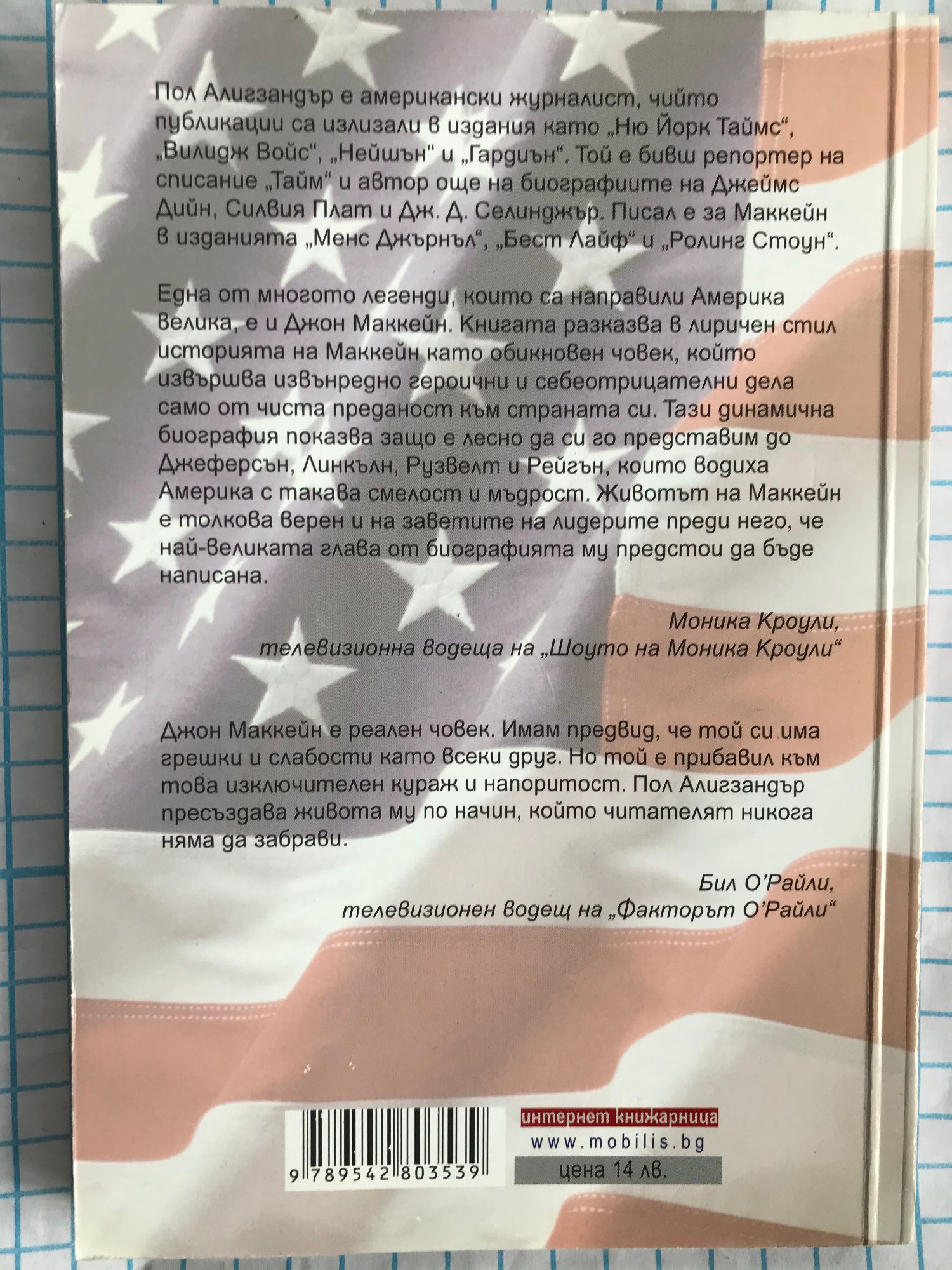 Пол Алигзандър е американски журналист, чийто публикации са излизали 8 издания като „Ню Йорк Таймс", „Вилидж Войс", „Нейшън" и „Гардиън". Той е бивш репортер на списание „Тайм" и автор още на биографиите на Джеймс Дийн, Силвия Плат и Дж. Д. Селинджър. Писал е за Маккейн 8 изданията „Менс Джърнъл", „Бест Лайф" и „Ролинг Стоун". Една от многото легенди, които са направили Америка велика, е и Джон Маккейн. Книгата разказва в лиричен стил историята на Маккейн като обикновен човек, който извършва извънредно героични и себеотрицателни дела само от чиста преданост към страната си. Тази динамична биография показва защо е лесно да си го представим до Джеферсън, Линкълн, Рузвелт и Рейгън, които водиха Америка с такава смелост и мъдрост. Животът на Маккейн е толкова верен и на заветите на лидерите преди него, че най-великата глава от биографията му предстои да бъде написана. Моника Кроули, телевизионна водеща на „Шоуто на Моника Кроули" Джон Маккейн е реален човек. Имам предвид, че той си има грешки и слабости като всеки друг. Но той е прибавил към това изключителен кураж и напоритост. Пол Алигзандър пресъздава живота му по начин, който читателят никога няма да забрави. Бил О'Райли, телевизионен водещ на „факторът О'Райли"