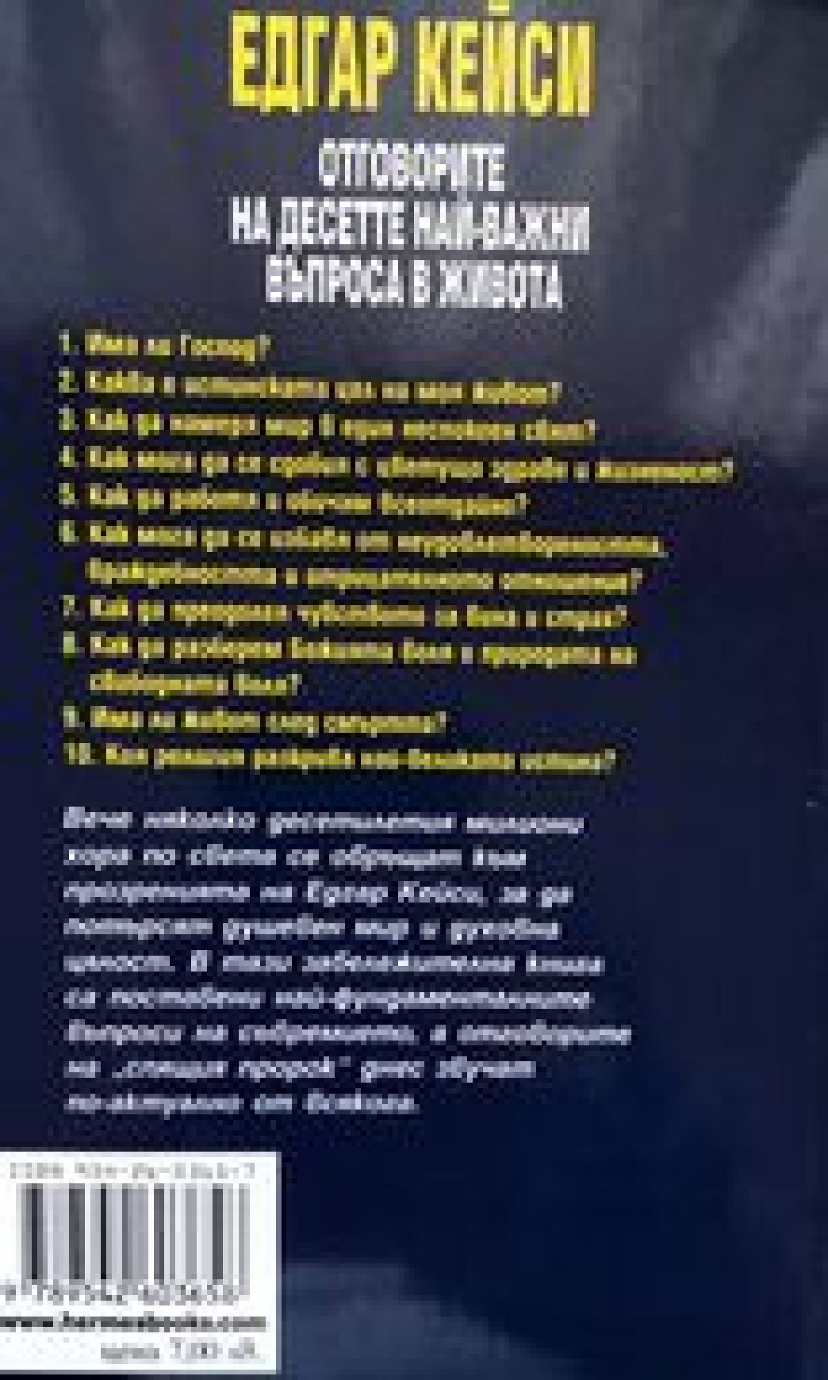 Вече няколко десетилетия милиони хора по света се обръщат към прозренията на Едгар Кейси, за да потърсят душевен мир и духовна цялост. В тази забележителна книга са поставени най-фундаменталните въпроси на съвремието, а отговорите на „спящия пророк" днес звучат по-актуално отвсякога.