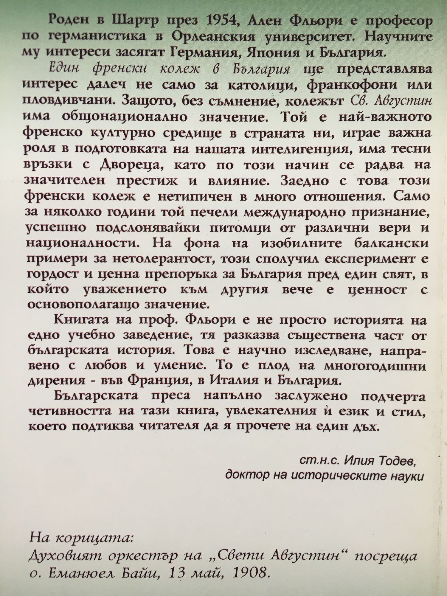 Роден в Шартр през 1954, Ален Фльори е професор по германистика в Орлеанския университет. Научните му интереси засягат Германия, Япония и България. “Един френски колеж в България” ще представлява интерес далеч не само за католици, франкофони или пловдивчани. Защото, без съмнение, колежът “Св. Августин” има общонационално значение. Той е най-важното френско културно средище в страната ни, играе важна роля в подготовката на нашата интелигенция, има тесни връзки с Двореца, като по този начин се радва на значителен престиж и влияние. Заедно с това този френски колеж е нетипичен в много отношения. Само за няколко години той печели международно признание, успешно подслонявайки питомци от различни вери и националности. На фона на изобилните балкански примери за нетолерантост, този сполучил експеримент е гордост и ценна препоръка за България пред един свят, в който уважението към другия вече е ценност с основополагащо значение. Книгата на проф. Фльори е не просто историята на едно учебно заведение, тя разказва съществена част от българската история. Това е научно изследване, направено с любов и умение. То е плод на многогодишни дирения - във Франция, в Италия и България. Българската преса напълно заслужено подчерта четивността на тази книга, увлекателния й език и стил, което подтиква читателя да я прочете на един дъх. ст.н.с. Илия Тодев, доктор на историческите науки На корицата: Духовият оркестър на “Свети Августин” посреща о. Еманюел Байи, 13 май, 1908
