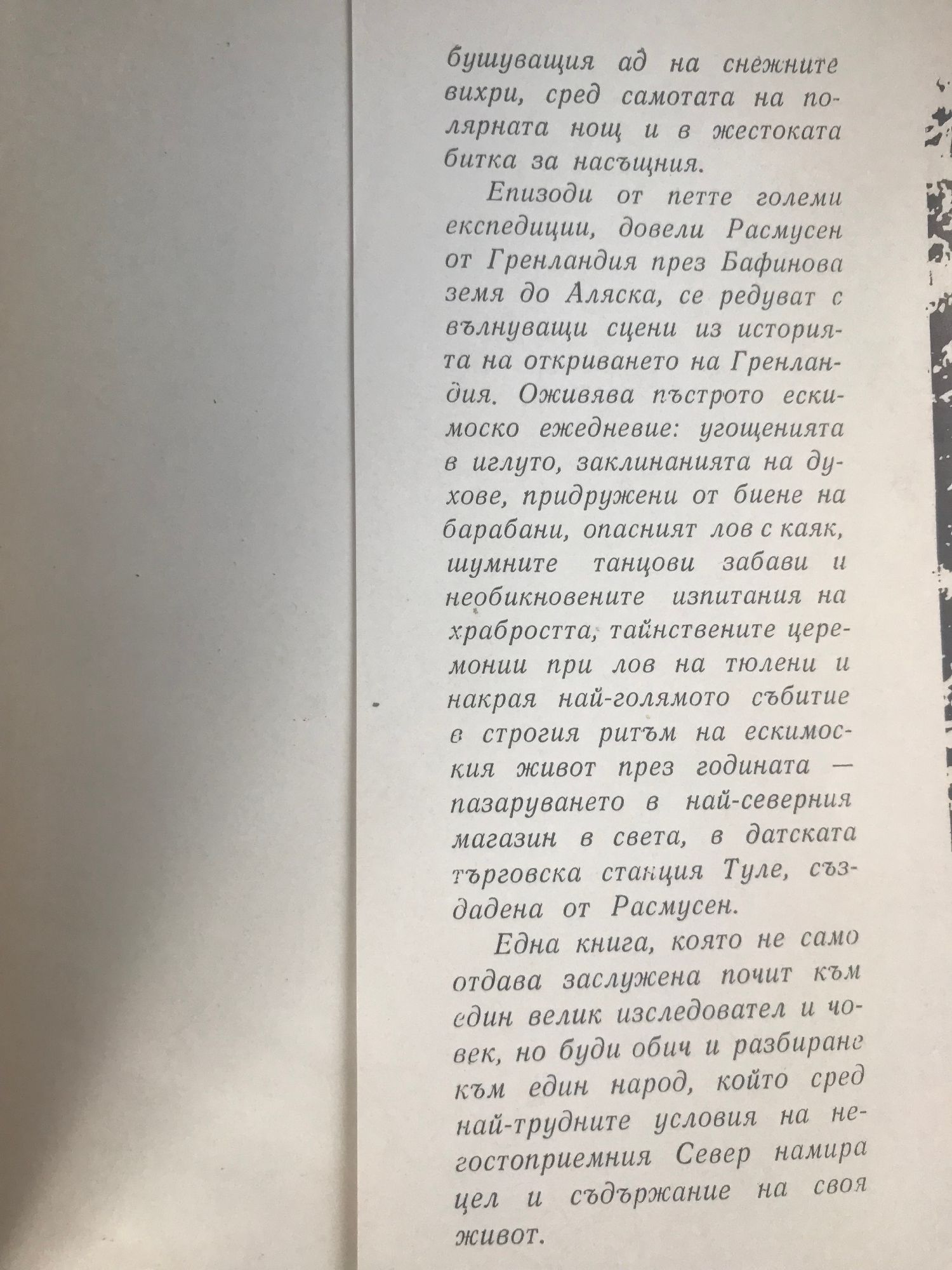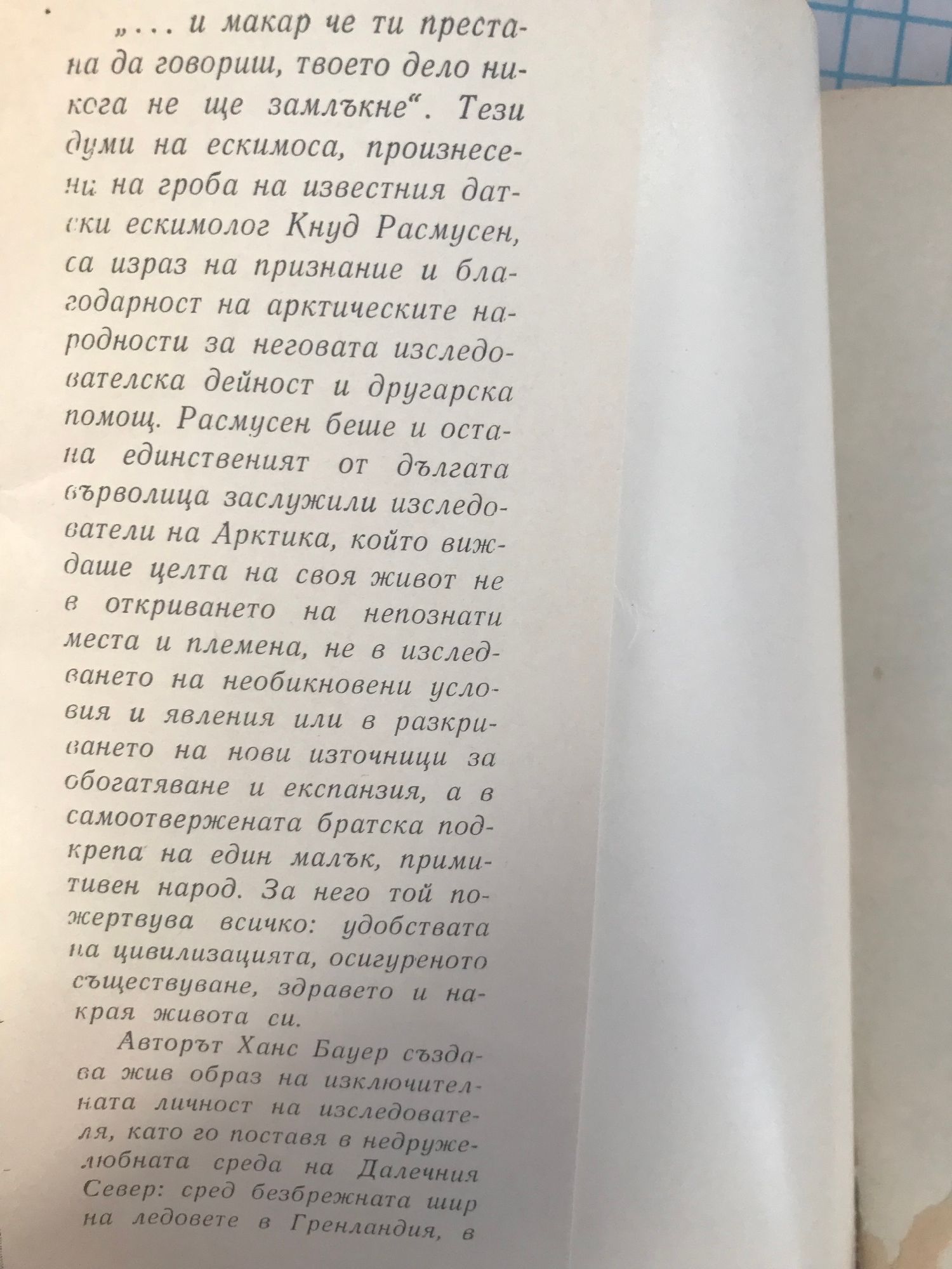 Книгата „Един живот за ескимосите“ на Ханс Бауер се опитва да разкаже биографията на Кнуд Расмусен – един от първите полярни изследователи. „ … и макар че ти престана да говориш, твоето дело никога не ще замлъкне“. Тези думи на ескимоса, произнесени на гроба на известния датски ескимолог Кнуд Расмусен, са израз на признание и благодарност на арктическите народности за неговата изследователска дейност и другарска помощ. Расмусен беше и остана единственият от дългата върволица заслужили изследователи на Арктика…