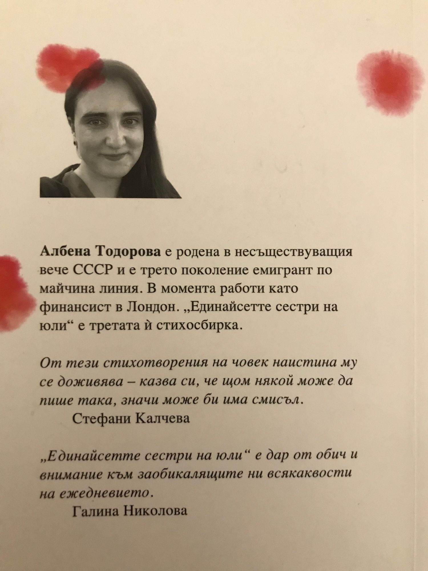 От тези стихотворения на човек наистина му се доживява – казва си, че щом някой може да пише така, значи може би има смисъл. Стефани Калчева „Единайсетте сестри на юли“ е дар от обич и внимание към заобикалящите ни всякаквости на ежедневието. Галина Николова Албена Тодорова е родена в несъществуващия вече СССР и е трето поколение емигрант по майчина линия. В момента работи като финансист в Лондон. „Единайсетте сестри на юли“ е третата ? стихосбирка.