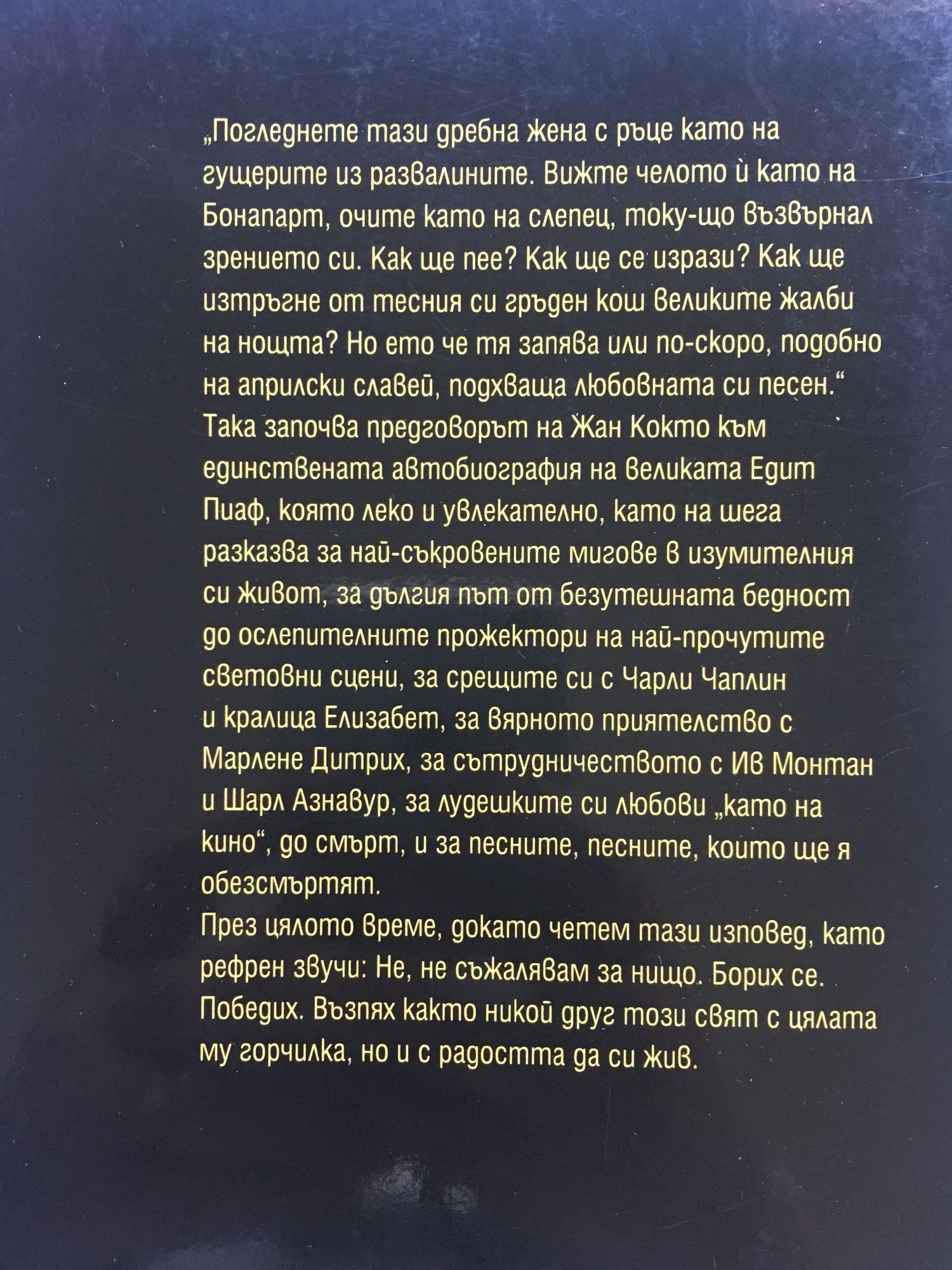 „Погледнеше тази дребна жена с ръце като на гущерите из развалините. Вижте челото ù като на Бонапарт, очите като на слепец, току-що възвърнал зрението си. Как ще пее? Как ще се изрази? Как ще изтръгне от тесния си гръден кош великите жалби на нощта? Но ето че тя запява или по-скоро, подобно на априлски славей, подхваща любовната си песен." Така започва предговорът на Жан Кокто към единствената автобиография на великата Едит Пиаф. която леко и увлекателно, като на шега разказва за най-съкровените мигове в изумителния си живот, за дългия път от безутешната бедност до ослепителните прожектори на най-прочутите световни сцени, за срещите си с Чарли Чаплин и кралица Елизабет, за вярното приятелство с Марлене Дитрих, за сътрудничеството с Ив Монтан и Шарл Азнавур, за лудешките си любови „като на кино", до смърт, и за песните, песните, които ще я обезсмъртят. През цялото време, докато четем тази изповед, като рефрен звучи:" Не, не съжалявам за нищо. Борих се. Победих. Възпях както никой друг този свят с цялата му горчилка, но и с радостта да си жив."