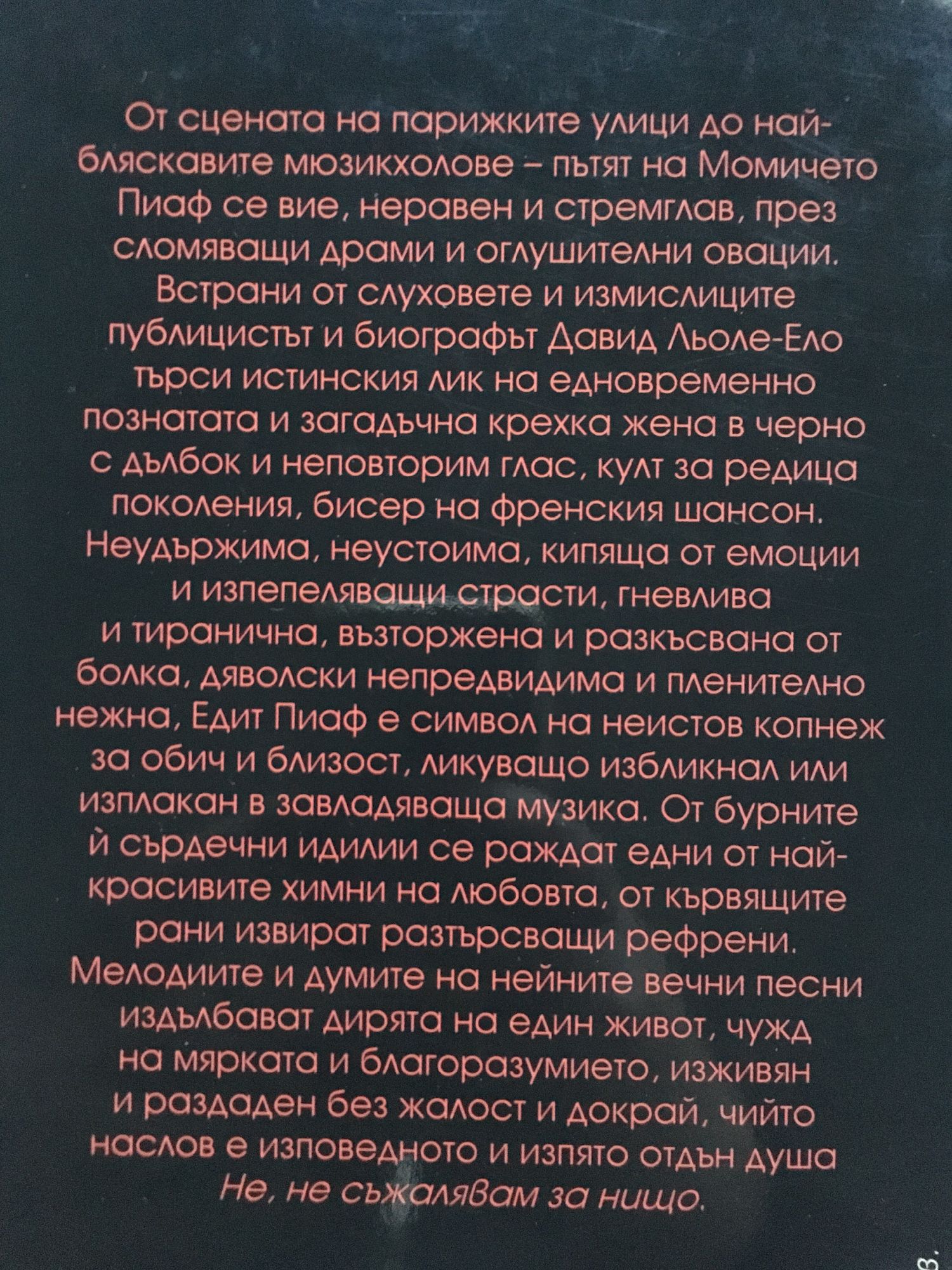 От сцената на парижките улици до най-бляскавите мюзикхолове - пътят на Момичето Пиаф се вие, неравен и стремглав, през сломяващи драми и оглушителни овации. Встрани от слуховете и измислиците публицистът и биографът Давид Льоле-Ело търси истинския лик на едновременно познатата и загадъчна крехка жена в черно с дълбок и неповторим глас, култ за редица поколения, бисер на френския шансон. Неудържима, неустоима, кипяща от емоции и изпепеляващи страсти, гневлива и тиранична, възторжена и разкъсвана от болка, дяволски непредвидима и пленително нежна, Едит Пиаф е символ на неистов копнеж за обич и близост, ликуващо избликнал или изплакан в завладяваща музика. От бурните й сърдечни идилии се раждат едни от най-красивите химни на любовта, от кървящите рани извират разтърсващи рефрени. Мелодиите и думите на нейните вечни песни издълбават дирята на един живот, чужд на мярката и благоразумието, изживян и раздаден без жалост и докрай, чийто наслов е изповедното и изпято отдън душа "Не, не съжалявам за нищо."