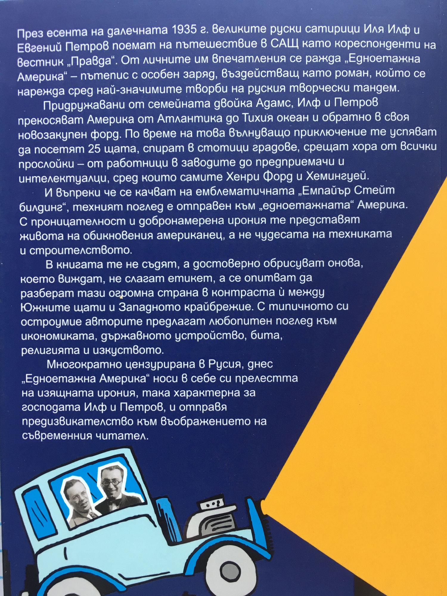 През есента на далечната 1935 г. великите руски сатирици Иля Илф и Евгений Петров поемат на пътешествие в САЩ като кореспонденти на вестник „Правда“. От личните им впечатления се ражда „Едноетажна Америка“ – пътепис с особен заряд, въздействащ като роман, който се нарежда сред най-значимите творби на руския творчески тандем. Придружавани от семейната двойка Адамс, Илф и Петров прекосяват Америка от Атлантика до Тихия океан и обратно в своя новозакупен сив форд. По време на това вълнуващо приключение те успяват да посетят 25 щата, спират в стотици градове, срещат хора от всички прослойки – от работници в заводите до предприемачи и интелектуалци, сред които самите Хенри Форд и Хемингуей. И въпреки че се качват на емблематичната „Емпайър Стейт билдинг“, техният поглед е отправен към „едноетажната“ Америка. С проницателност и добронамерена ирония те представят живота на обикновения американец, а не чудесата на техниката и строителството. В книгата те не съдят, а достоверно обрисуват онова, което виждат, не слагат етикет, а се опитват да разберат тази огромна страна в контраста й между Южните щати и Западното крайбрежие. С типичното си остроумие авторите предлагат любопитен поглед към икономиката, държавното устройство, бита, религията и изкуството. Многократно цензурирана в Русия, днес „Едноетажна Америка“ носи в себе си прелестта на изящната ирония, така характерна за господата Илф и Петров, и отправя предизвикателство към въображението на съвременния читател.