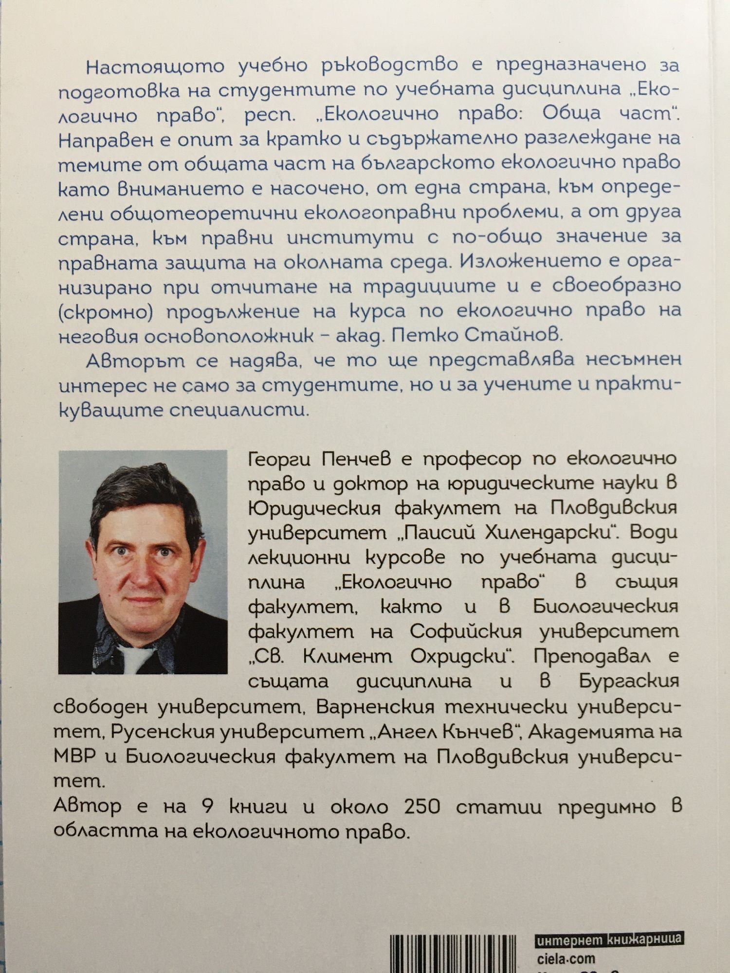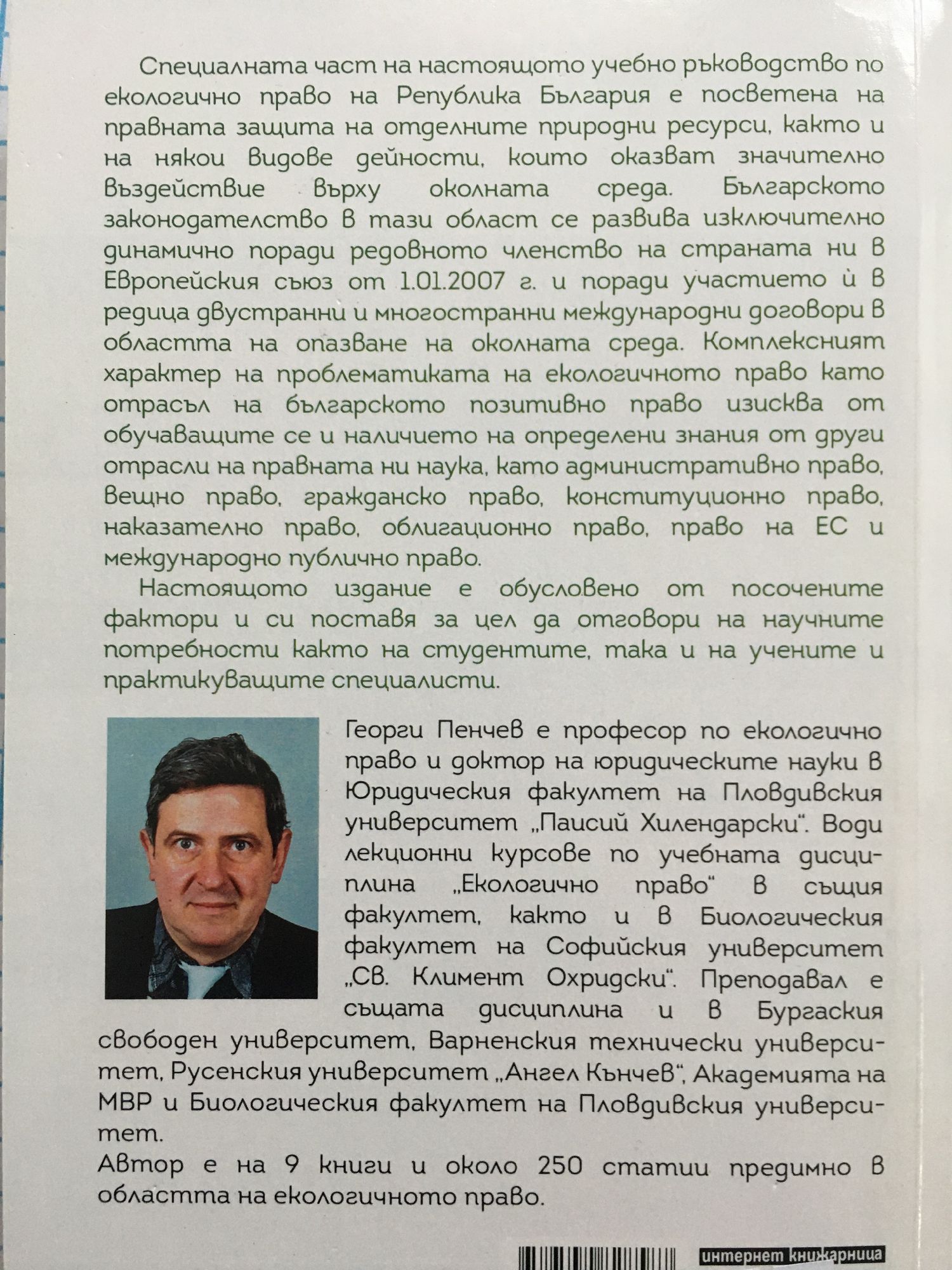 Република България се намира в период на преход към пазарна икономика и по-нататъшна демократизация на обществените процеси. Първоначално асоциираното, а след 1.01.2007 г. –пълноправното є членство в Европейския съюз (ЕС) допълнително обуславят динамичното развитие не само на екологичното, но и на цялото законодателство. Поради това учебната програма по дисциплината „Екологично право“, респ. „Екологично право: Обща част“ е необходимо да отчита това развитие. Настоящото учебно ръководство има предназначението на основа за подготовката на студентите по учебната дисциплина „Екологично право“, респ. „Екологично право: Обща част“, която е необходимо да бъде развивана в хода на лекционния курс и самоподготовката. Направен е опит за кратко и съдържателно разглеждане на темите от общата част на българското екологично право при отчитане на обстоятелството, че проблемите на международното публично екологично право и на европейското екологично право (правото на Европейския съюз по околната среда) трябва да бъдат предмет на самостоятелни учебни дисциплини. Някои повторения не са избегнати по систематични и учебни съображения. Изложението е организирано при отчитане на традициите и е своеобразно (скромно) продължение на курса по екологично право на неговия основоположник – акад. Петко Стайнов в книгата му „Защита на природата (правни изследвания)“ от 1970 г., която остава най-задълбоченият и фундаментален труд в тази област на научното познание. Принос в развитието на учебната правна литература в разглежданата област имат и други наши учени. При разработването на това учебно ръководство са съобразени литературата, законодателството и съдебната практика към 22.03.2019 г. Авторът се надява, че то ще представлява несъмнен интерес не само за студентите, но и за учените и практикуващите специалисти. Спрямо редица нормативни актове, посочени в текста не са отбелязани неколкократните им изменения и допълнения, като само се изтъква обстоятелството, че те са изменяни и допълвани чрез съкращението „изм. и доп.“. Справка за тези изменения и допълнения в тях може да се направи в правно-информационните системи „Апис“ (https://apis.bg) и „Сиела“ (https://www.ciela.net), както и евентуално в Интернет-страницата на българския правен портал „Lex.bg“ (http://www.lex.bg). Настоящото второ преработено и допълнено издание беше обусловено от голямата динамика в развитието на българското екологично законодателство след първото издание на това учебно ръководство през 2011 г. Специалната част на настоящото учебно ръководство поекологично право на Република България е посветена на прав-ната защита на отделните природни ресурси, както и на някоивидове дейности, които оказват значително въздействие върхуоколната среда. Българското законодателство в тази област се развива изключително динамично поради, от една страна, ре-довното членство на страната ни в Европейския съюз (ЕС) от1.01.2007 г., а от друга страна, поради участието є в редицадвустранни и многостранни международни договори в областтана опазване на околната среда 1 . Ето защо излизането от печатна всеки учебник по екологично право, особено по отношениена специалната му част, крие риска от т.нар. „бързо остарява-не“. Това налага обучаващите се (студенти, докторанти, специ-алисти от практиката и др.) да използват при самоподго