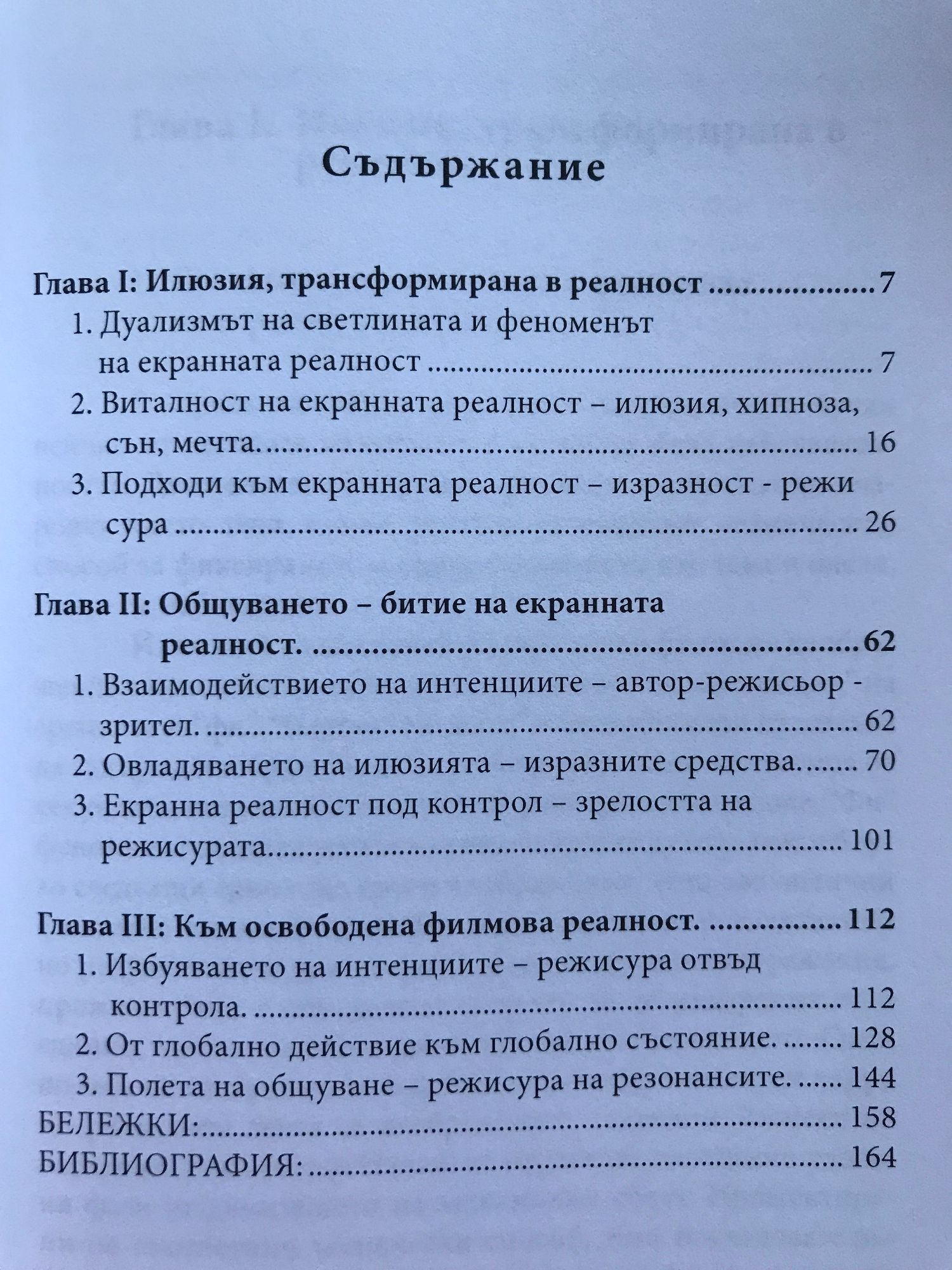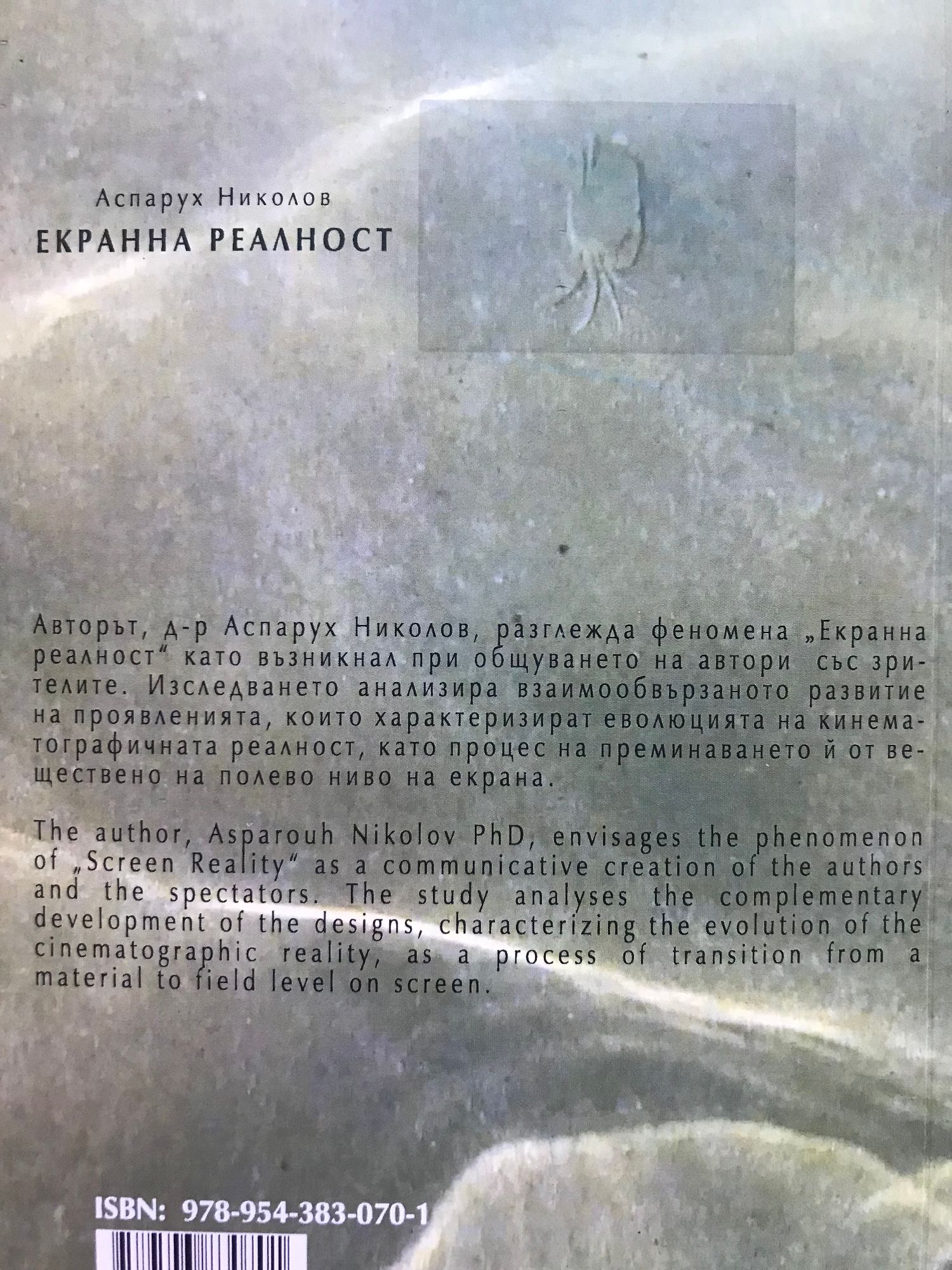 Авторът, д-р Аспарух Николов, разглежда феномена „Екранна реалност" като възникнал при общуването на автори със зрителите. Изследването анализира взаимообвързаното развитие на проявленията, които характеризират еволюцията на кинематографичната реалност, като процес на преминаването й от веществено на полево ниво на екрана. The author, Asparouh Nikolov PhD, envisages the phenomenon of „Screen Reality" as a communicative creation of the authors and the spectators. The study analyses the complementary development of the designs, characterizing the evolution of the cinematographic reality, as a process of transition from a material to field level on screen.