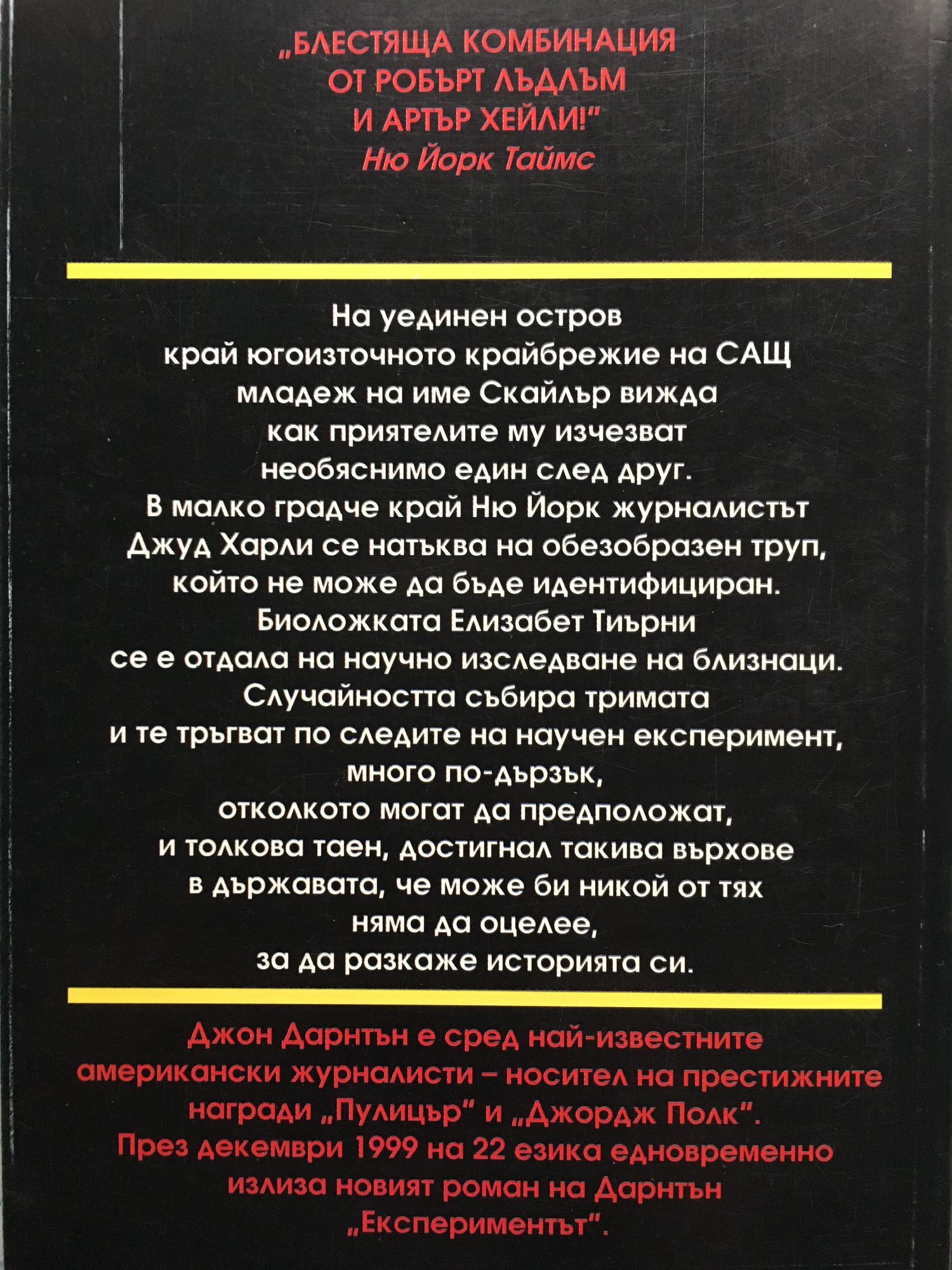 На уединен остров край югоизточното крайбрежие на САЩ младеж на име Скайлър вижда как приятелите му изчезват необяснимо един след друг.В малко градче край Ню Йорк журналистът Джуд Харли се натъква на обезобразен труп, който не може да бъде идентифициран. Биоложката Елизабет Тиърни се е отдала на научно изследване на близнаци. Случайността ги събира тримата и те тръгват по следите на научен експеримент, много по-дързък, отколкото могат да предположат, и толкова таен, достигнал такива върхове в държавата, че може би никой от тях няма да оцелее, за да разкаже историята си.
