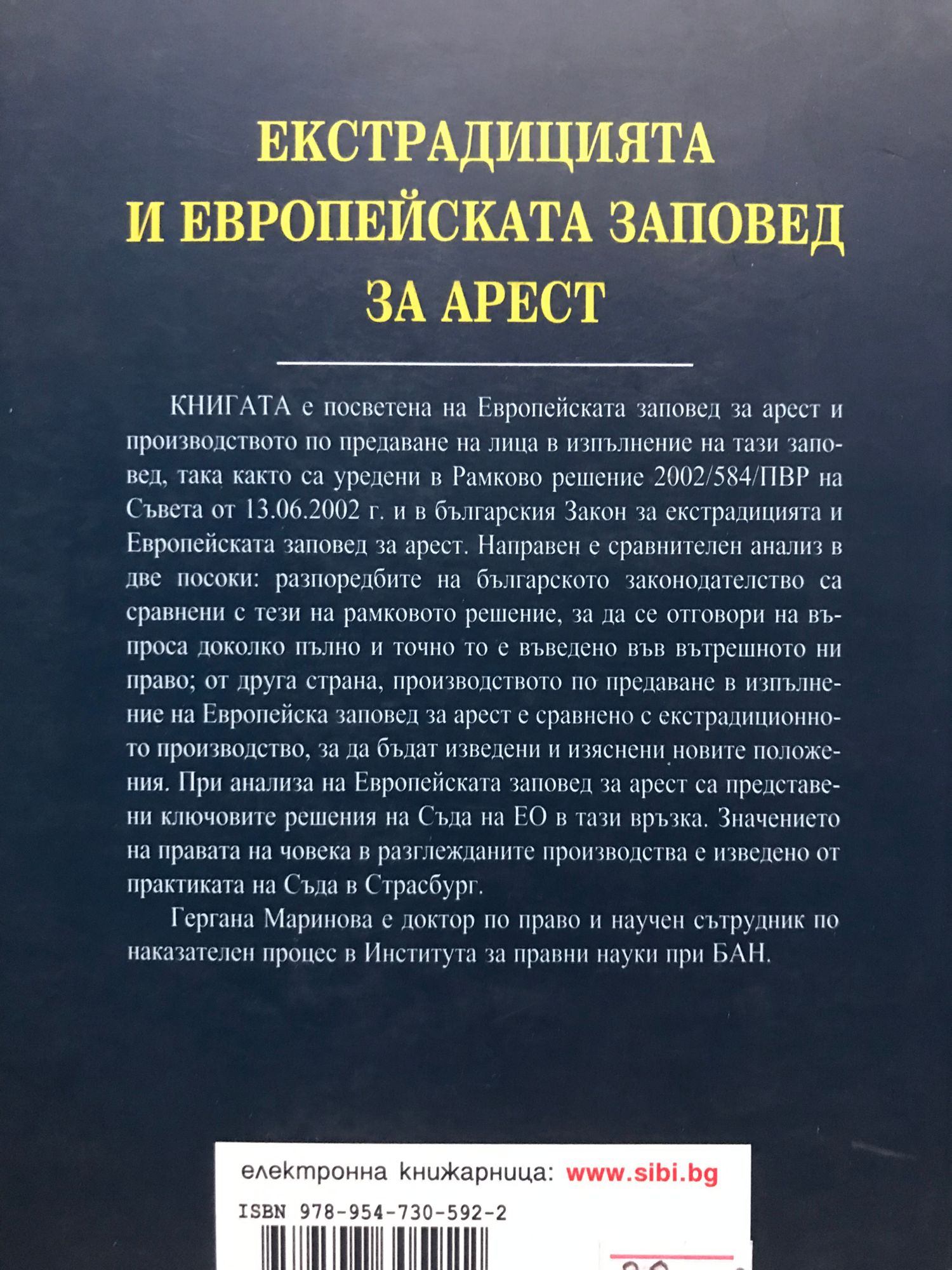 Книгата е посветена на Европейската заповед за арест и производството по предаване на лица в изпълнение на тази заповед, така както са уредени в Рамково решение 2002/584/ПВР на Съвета от 13.06.2002 г. и в българския Закон за екстрадицията и Европейската заповед за арест. Сравнителният анализ е в две посоки: разпоредбите на българското законодателство са сравнени с тези на рамковото решение, за да се отговори на въпроса доколко пълно и точно то е въведено във вътрешното ни право; от друга страна, производството по предаване в изпълнение на Европейска заповед за арест е сравнено с екстрадиционното производство, за да бъдат изведени и изяснени новите положения. При анализа на Европейската заповед за арест са представени ключовите решения на Съда на ЕО в тази връзка. Значението на правата на човека в разглежданите производства е изведено от практиката на Съда в Страсбург. Гергана Маринова е доктор по право и научен сътрудник по наказателен процес в Института за правни науки при БАН.