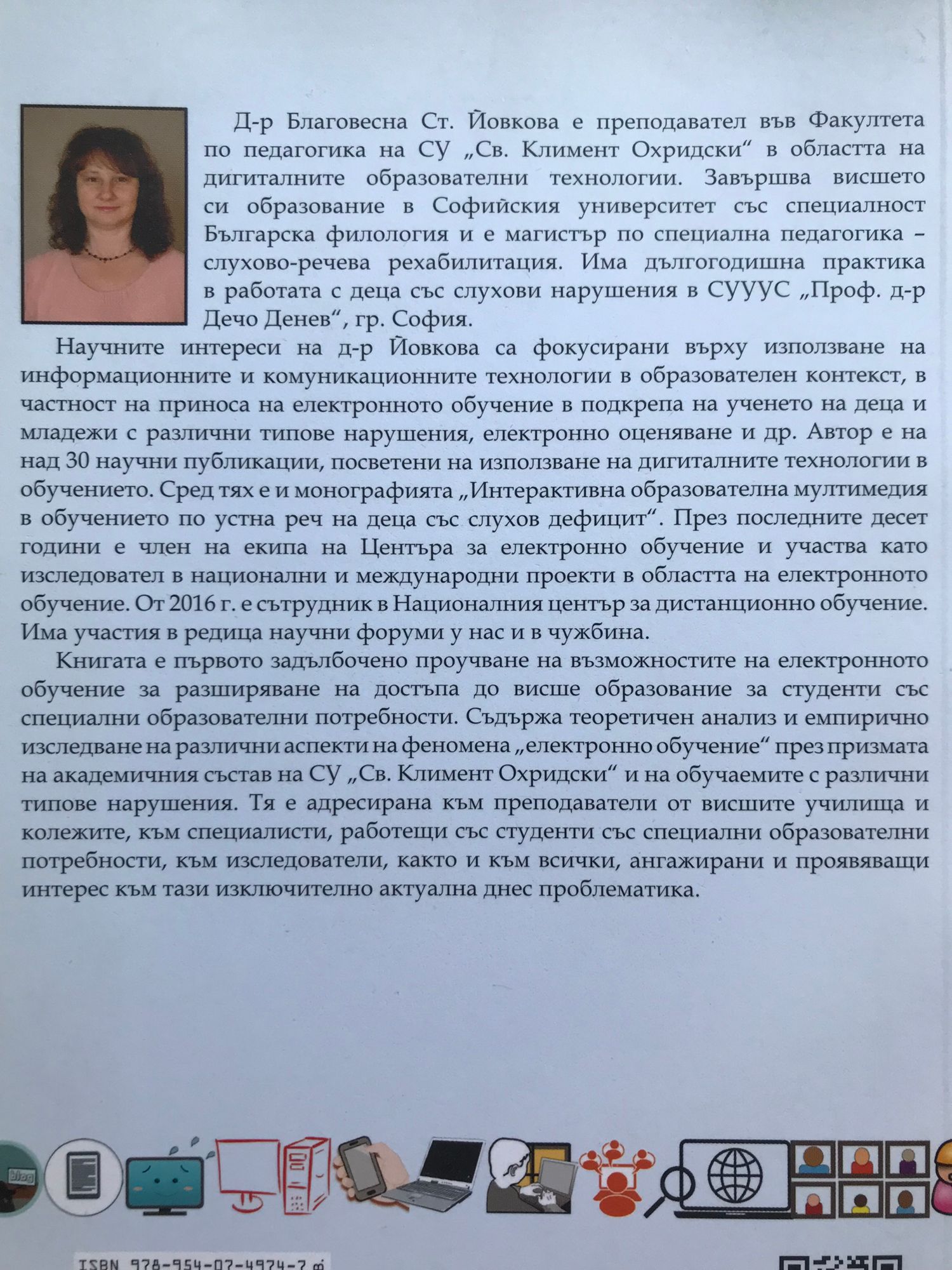 Книгата е първото задълбочено проучване на възможностите на електронното обучение за разширяване на достъпа до висше образование за студенти със специални образователни потребности . Съдържа теоретичен анализ и емпирично изследване на различни аспекти на феномена “ електронно обучение “ през призмата на академичния състав на СУ “ Св. Климент Охридски “ и на обучаемите с различни типове нарушения . Тя е адресирана към преподаватели от висшите училища и колежите , към специалисти , работещи със студенти със специални образователни потребности , към изследователи , както и към всички , ангажирани и проявяващи интерес към тази изключително актуална днес проблематика .