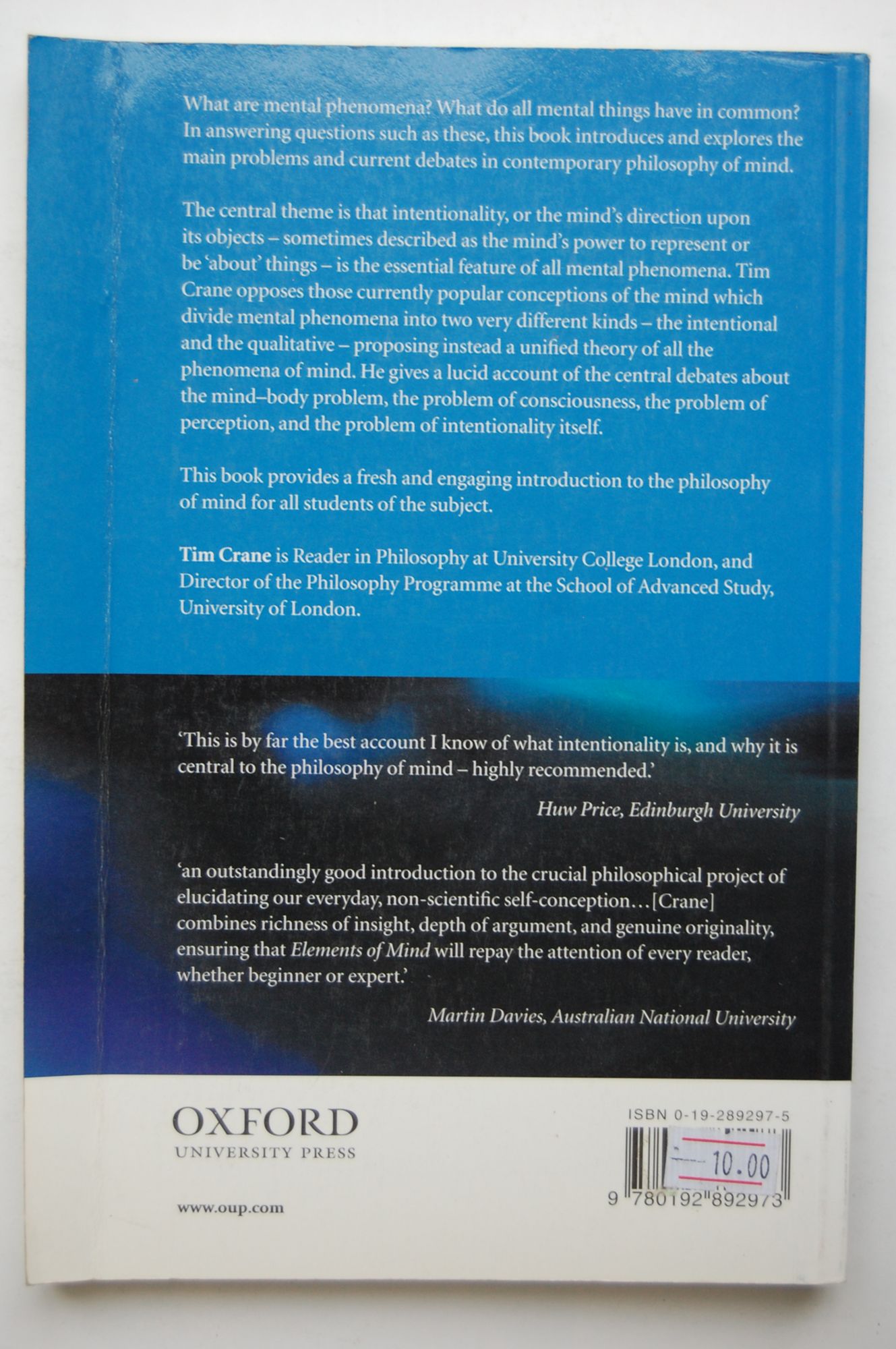 In this book I attempt to give an account of what I see to be the main problems of the philosophy of mind: the mind-body problem, the problem of intentionality (or mental representation), the problem of consciousness, and the problem of perception. I also attempt to give solutions to these problems. I do not, of course, pretend that these solutions are without problems of their own, but it seems to me that a book with an opinionated approach to philosophical problems tends to be more interesting than a bland survey. Nor do I pretend, when talking about 'the main problems of philosophy of mind, that these are the only problems, or that there is only one 'mind-body problem' or ‘problem of consciousness'. On the contrary, in my discussion of these problems I will often distinguish a number of things falling under these names, although some of them I do not discuss in any detail. Nonetheless, it seems to me that the traditional names for the problems provide, so to speak, the coordinates of a useful map of this field of study, and it is thus that I intend to use them. The central theme of the book is that intentionality, the mind's direction upon its objects, sometimes called the mind's power to represent or be ‘about things, is the essential feature of all mental phenomena. This is Brentano's thesis, named in honour of Franz Brentano, the German philosopher and founder of the phenomenological movement. Although I take the name and the inspiration for the thesis from Brentano, the book is not in any sense a book about Brentano or the movement he founded, nor does it defend the thesis in the sense in which he meant it. I explain what I mean by intentionality in Chapter 1, and I give accounts of the intentionality of consciousness, thought, and perception in Chapters 3, 4, and 5. Chapter 2 takes up a subsidiary theme: the mind-body problem, and the extent to which a physicalist reductive account of mental phenomena is possible, or even necessary. One conclusion of Chapter 2 is that much of what is interesting about the mind is left open when the question of physicalism is settled. At its simplest, the point can be put like this: suppose physicalism is true, and mental properties are identical to physical properties. We still need to know which physical properties these are, what are the general characteristics of these properties, how we know about them, and so on. Alternatively, suppose the sort of 'emergentism' I favour is true: mental properties are causally efficacious 'emergent properties of human beings and other creatures. We still need to know which emergent properties these are, what are the general characteristics of these properties, and how we know about them.