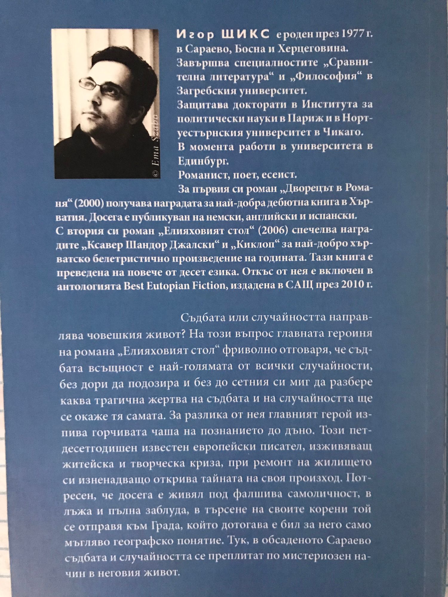Съдбата или случайността направлява човешкия живот? На този въпрос главната героиня на романа „Елияховият стол" фриволно отговаря, че съдбата всъщност е най-голямата от всички случайности, без дори да подозира и без до сетния си миг да разбере каква трагична жертва на съдбата и на случайността ще се окаже тя самата. За разлика от нея главният герой изпива горчивата чаша на познанието до дъно. Този петдесетгодишен известен европейски писател, изживяващ житейска и творческа криза, при ремонт на жилището си изненадващо открива тайната на своя произход. Потресен, че досега е живял под фалшива самоличност, в лъжа и пълна заблуда, в търсене на своите корени той се отправя към Града, който дотогава е бил за него само мъгляво географско понятие. Тук, в обсаденото Сараево съдбата и случайността се преплитат по мистериозен начин в неговия живот.
