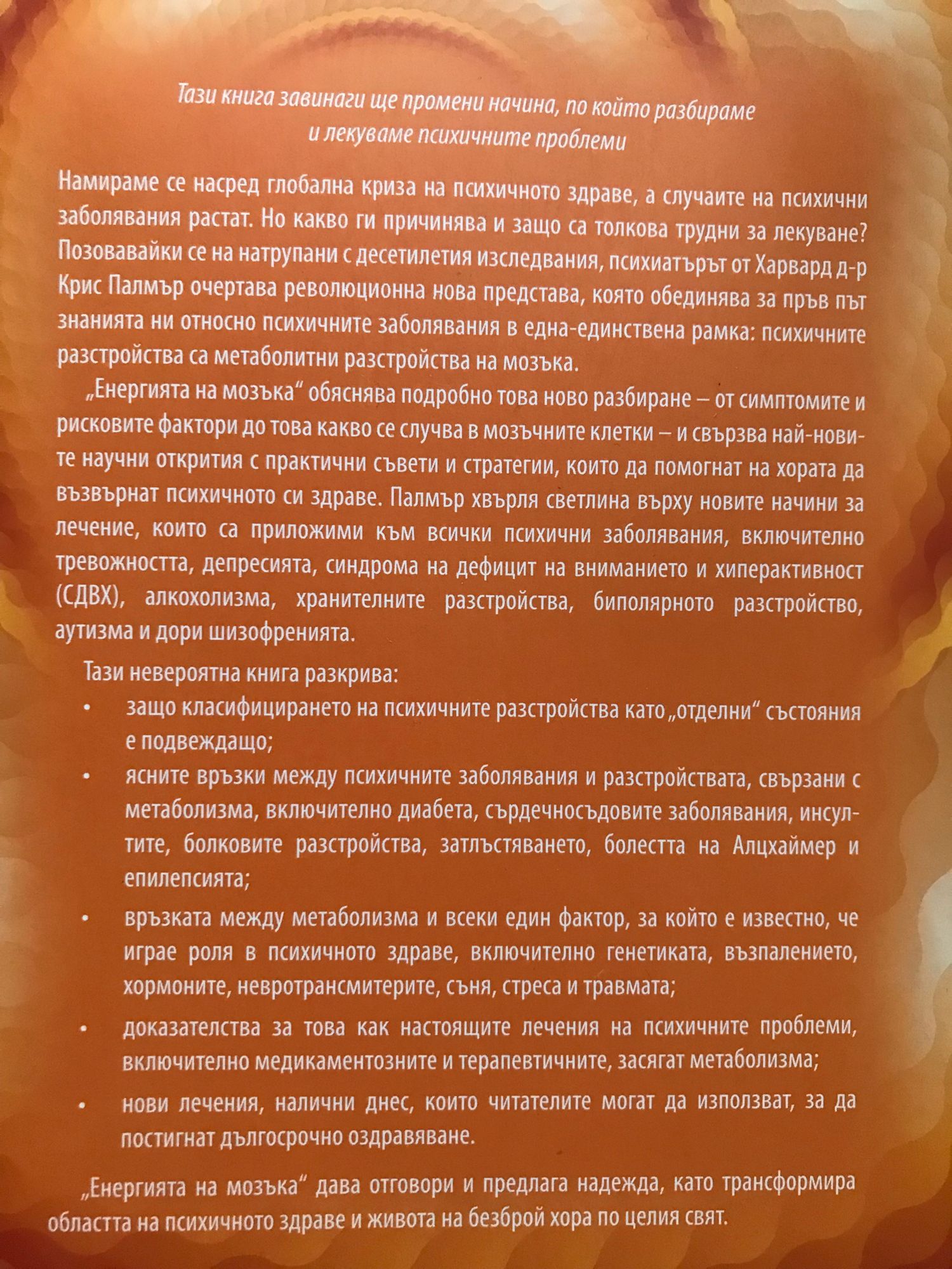 Тази книга завинаги ще промени начина, по който разбираме и лекуваме психичните проблеми. Намираме се насред глобална криза на психичното здраве, а случаите на психични заболявания растат. Но какво ги причинява и защо са толкова трудни за лекуване? Позовавайки се на натрупани с десетилетия изследвания, психиатърът от Харвард д-р Крис Палмър очертава революционна нова представа, която обединява за пръв път знанията ни относно психичните заболявания в една-единствена рамка: психичните разстройства са метаболитни разстройства на мозъка. Енергията на мозъка обяснява подробно това ново разбиране - от симптомите и рисковите фактори до това какво се случва в мозъчните клетки - и свързва най-новите научни открития с практични съвети и стратегии, които да помогнат на хората да възвърнат психичното си здраве. Палмър хвърля светлина върху новите начини за лечение, които са приложими към всички психични заболявания, включително тревожността, депресията, синдрома на дефицит на вниманието и хиперактивност (СДВХ), алкохолизма, хранителните разстройства, биполярното разстройство, аутизма и дори шизофренията. Тази невероятна книга разкрива: защо класифицирането на психичните разстройства като отделни състояния е подвеждащо; ясните връзки между психичните заболявания и разстройствата, свързани с метаболизма, включително диабета, сърдечносъдовите заболявания, инсултите, болковите разстройства, затлъстяването, болестта на Алцхаймер и епилепсията; връзката между метаболизма и всеки един фактор, за който е известно, че играе роля в психичното здраве, включително генетиката, възпалението, хормоните, невротрансмитерите, съня, стреса и травмата; доказателства за това как настоящите лечения на психичните проблеми, включително медикаментозните и терапевтичните, засягат метаболизма; нови лечения, налични днес, които читателите могат да използват, за да постигнат дългосрочно оздравяване. Енергията на мозъка дава отговори и предлага надежда, като трансформира областта на психичното здраве и живота на безброй хора по целия свят.