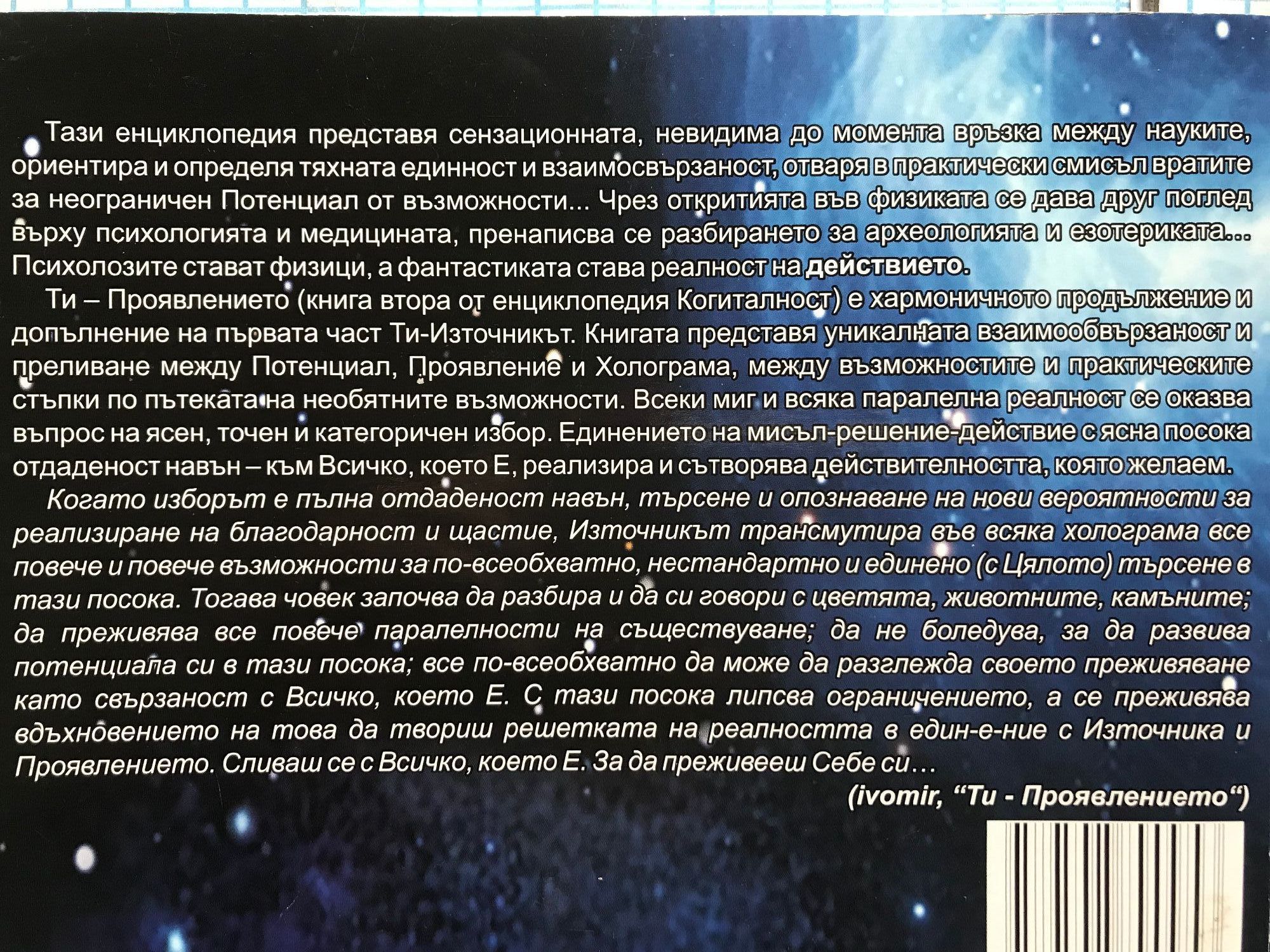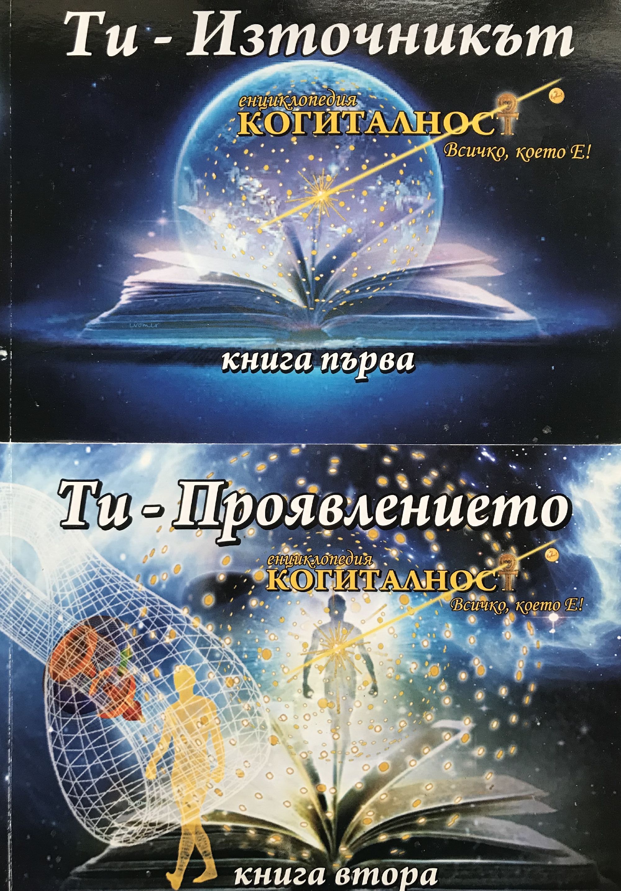 Книга 1: Всички факти в началото бяха парченца от пъзел, пръснати в необятността – разпилени, непоследователни, неподредени. Пристигащи хаотично в миговете, когато не ги търсиш и не ги очакваш… Светкавици, проблясващи в мрака, които е редно да уловиш в шепата си като светулки – да ги събереш с търпение, вдъхновение и отдаденост. Тогава, приел разпиляната хаотичност на своето незнание, с вяра в Нищото, подреждаш светлината на собствения си Живот. Книга 2: „Ти – Проявлението - Енциклопедия Когиталност 2“ е хармоничното продължение и допълнение на първата част от енциклопедията. Книгата представя уникалната взаимосвързаност и преливане между Потенциал, Проявление и Холограма, между възможностите и практическите стъпки по пътеката на необятните възможности. Всеки миг и всяка паралелна реалност се оказва въпрос на ясен, точен и категоричен избор. Единението на мисъл-решение-действие с ясна посока отдаденост навън – към Всичко, което Е, реализира и сътворява действителността, която желаем.
