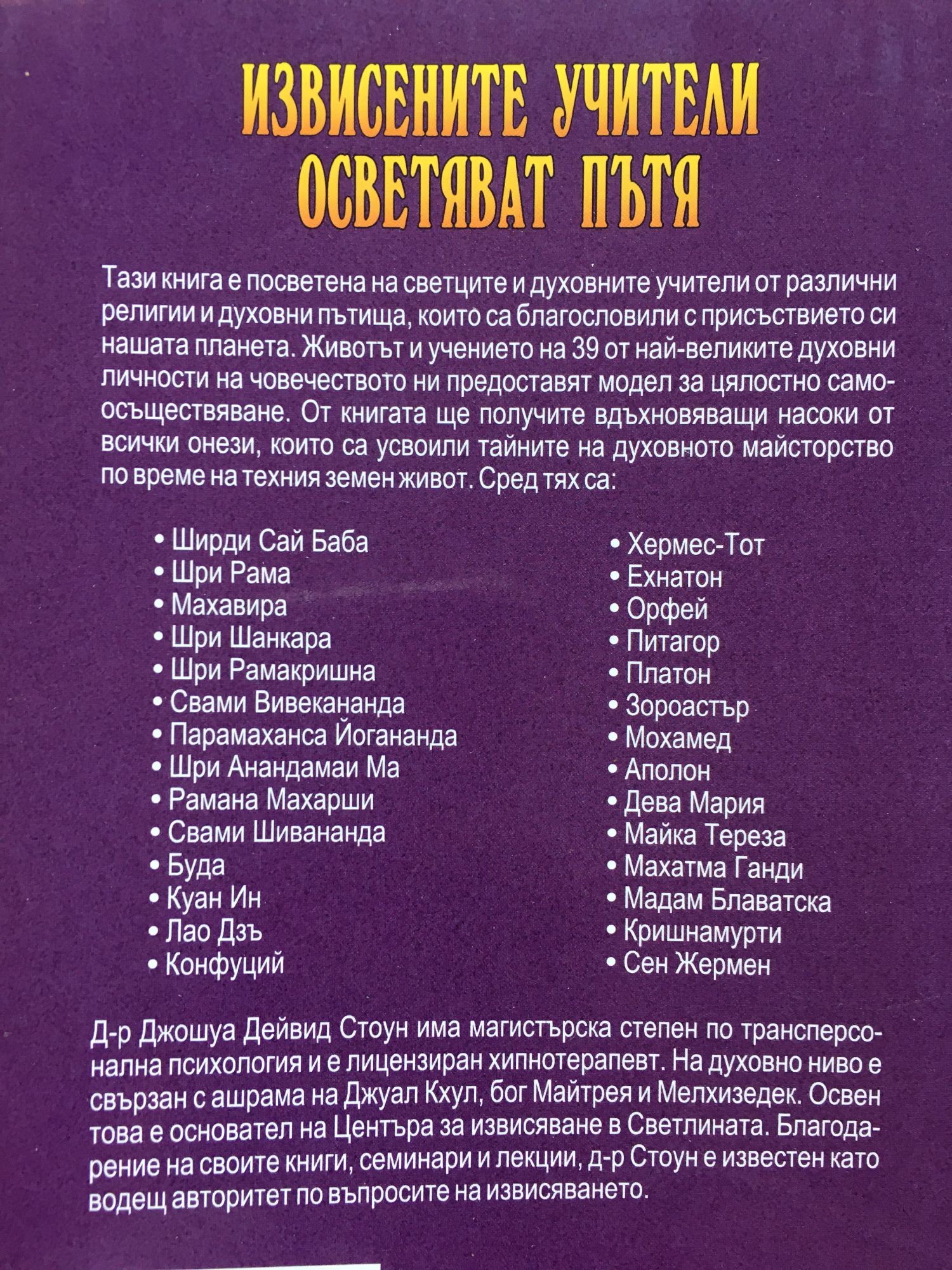 Тази книга е посветена на светците и духовните учители от всички религии и духовни пътища, които са благословили с присъствието си нашата планета. Животът и учението на 39 от най-великите духовни личности на човечеството ни предоставят модел за цялостно самоосъществяване. От книгата ще получите вдъхновяващи насоки от всички онези, които са усвоили тайните на духовното майсторство по време на техния земен живот. Сред тях са: * Ширди Сай Баба * Хермес-Тот * Шри Рама * Ехнатон * Махавира * Орфей * Шри Шанкара * Питагор * Шри Рамакришна * Платон * Свами Вивекананда * Зороастър * Парамаханса Йогананда * Мохамед * Шри Анандамаи Ма * Аполон * Рамана Махарши * Дева Мария * Свами Шивананда * Майка Тереза * Буда * Махатма Ганди * Куан Ин * Мадам Блаватска * Лао Дзъ * Кришнамурти * Конфуций * Сен Жермен Д-р Джошуа Дейвид Стоун има магистърска степен по трансперсонална психология и е лицензиран хипнотерапевт. На духовно ниво е свързан с ашрама на Джуал Кхул, бог Майтрея и Мелхизедек. Освен това е основател на Центъра за извисяване в Светлината. Благодарение на своите книги, семинари и лекции, д-р Стоун е известен като водещ авторитет по въпросите на извисяването.