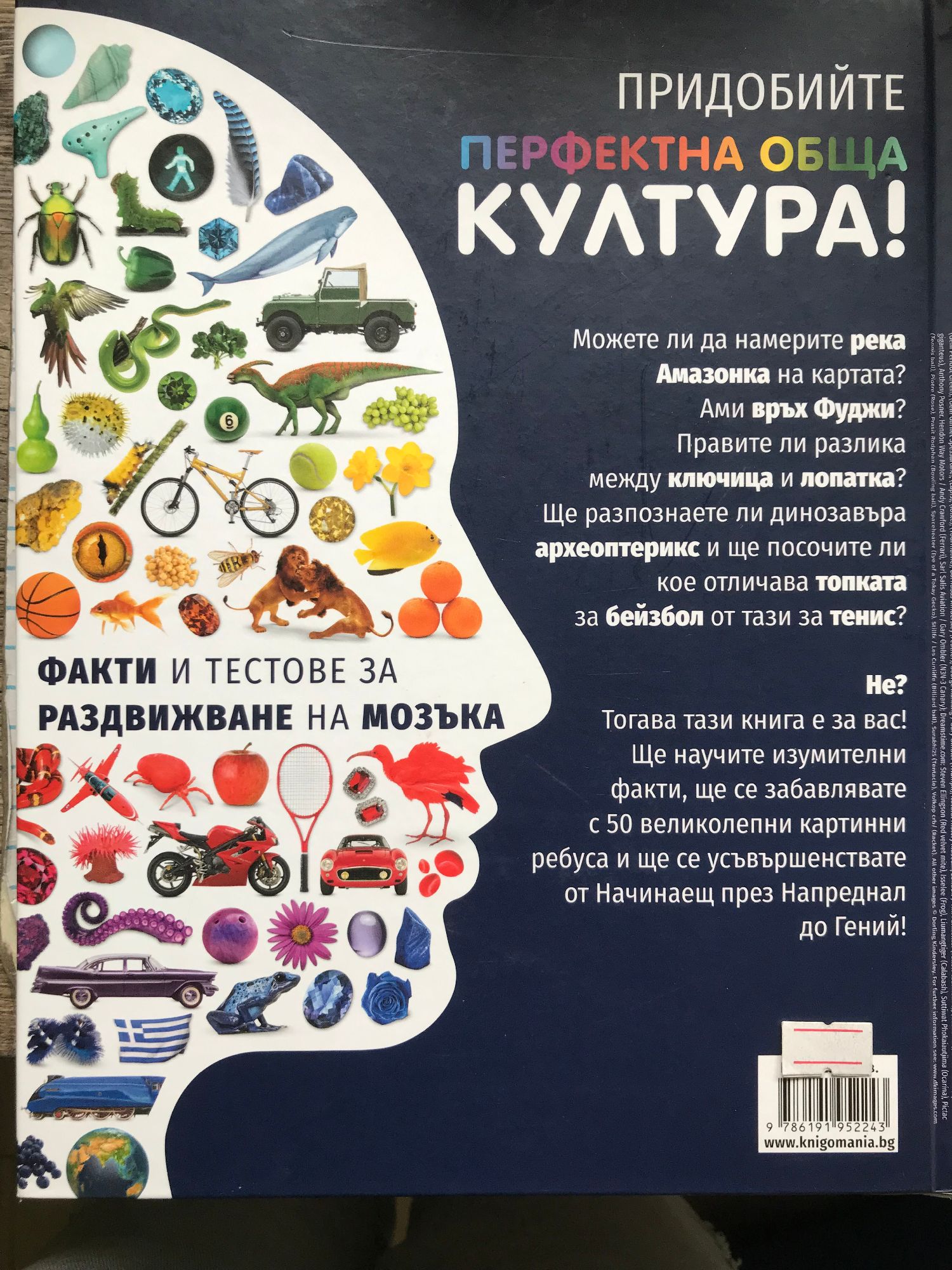 Придобийте ПЕРФЕКТНА ОБЩА КУЛТУРА! Можете ли да намерите река Амазонка на картата? Ами връх Фуджи? Правите ли разлика между ключица и лопатка? Ще разпознаете ли динозавъра археоптерикс и ще посочите ли кое отличава топката за бейзбол от тази за тенис? Не? Тогава тази книга е за вас! Ще научите изумителни факти, ще се забавлявате с 50 великолепни картинни ребуса и ще се усъвършенствате от Начинаещ през Напреднал до Гений!