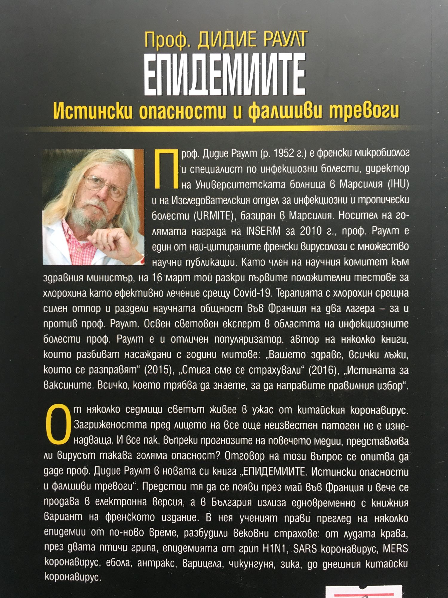 Книгата прави задълбочен преглед на пандемиите в исторически план. Авторът е световна величина в областта на вирусологията и пряк участник в актуалната битка с Covid-19. Книгата би могла да бъде полезна не само на интелигентния и любопитен читател, а и на лекарското съсловие като цяло. Бързото и всеобхватно разпространение на Covid-19 поражда много въпроси, а прогнозите на медиите в цял свят всяват паника и ужас, които поставят на изпитание и психическото здраве на хората. В книгата си ученият прави преглед на няколко епидемии от по-ново време, разбудили вековни страхове: от лудата крава, през двата птичи грипа, епидемията от грип H1N1, SARS коронавирус, MERS коронавирус, ебола, антракс, варицела, чикунгуня, зика. За да стигне до китайския коронавирус, който преобърна дневния ред на цяла планета, отне десетки хиляди човешки животи и вече нанася сериозни щети на световната икономика. Проф. Дидие Раулт (р. 1952 г.) е френски микробиолог и специалист по инфекциозни болести, директор на Университетската болница в Марсилия (IHU) и на Изследователския отдел за инфекциозни и тропически болести (URMITE), базиран в Марсилия. Носител на голямата награда на INSERM за 2010 г., проф. Раулт е един от най цитираните френски вирусолози с множество научни публикации. Като член на научния комитет към здравния министър, на 16 март той разкри първите положителни тестове за хлорохина като ефективно лечение срещу Covid-19. Терапията с хлорохин срещна силен отпор и раздели научната общност във Франция на два лагера – за и против проф. Раулт. Конфликтът изглежда по-скоро френско-френски, а зад него прозират интересите на големи фармацевтични компании. Освен световен експерт в областта на инфекциозните болести, професор Раулт е автор на няколко книги, които разбиват насаждани с години митове.