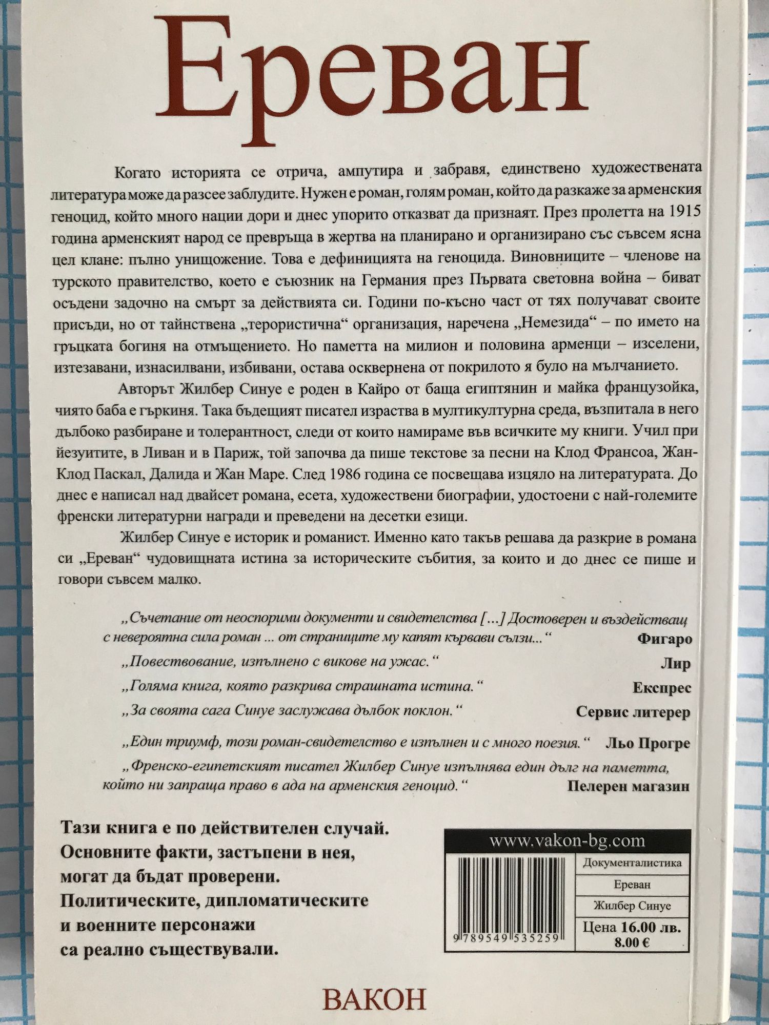 НЕПОНОСИМАТА ИСТИНА Когато историята се отрича, ампутира и забравя, единствено художествената литература може да разсее заблудите. Нужен е роман, голям роман, който да разкаже за арменския геноцид, който много нации дори и днес упорито отказват да признаят. През пролетта на 1815 година арменският народ се превръща в жертва на планирано и организирано със съвсем ясна цел клане: пълно унищожение. Това е дефиницията на геноцида. Виновниците – членове на турското правителство, което е съюзник на Германия през Първата световна война – биват осъдени задочно на смърт за действията си. Години по-късно част от тях получават своите присъди, но от тайнствена „терористична“ организация, наречена „Немезида“ – по името на гръцката богиня на отмъщението. Но паметта на милион и половина арменци – изселени, изтезавани, изнасилвани, избивани, остава осквернена от покрилото я було на мълчанието. Авторът Жилбер Синуе е роден в Кайро от баща египтянин и майка французойка, чиято баба е гъркиня. Така бъдещият писател израства в мултикултурна среда, възпитала в него дълбоко разбиране и толерантност, следи от които намираме във всичките му книги. Учил при йезуитите, в Ливан и в Париж, той започва да пише текстове за песни на Клод Франсоа, Жан-Клод Паскал, Далида и Жан Маре. След 1986 година се посвещава изцяло на литературата. До днес е написал над двайсет романа, есета, художествени биографии, удостоени с най-големите френски литературни награди и преведени на десетки езици. Жилбер Синуе е историк и романист. Именно като такъв решава да разкрие в романа си „Ереван“ чудовищната истина за историческите събития, за които и до днес се пише и говори съвсем малко.