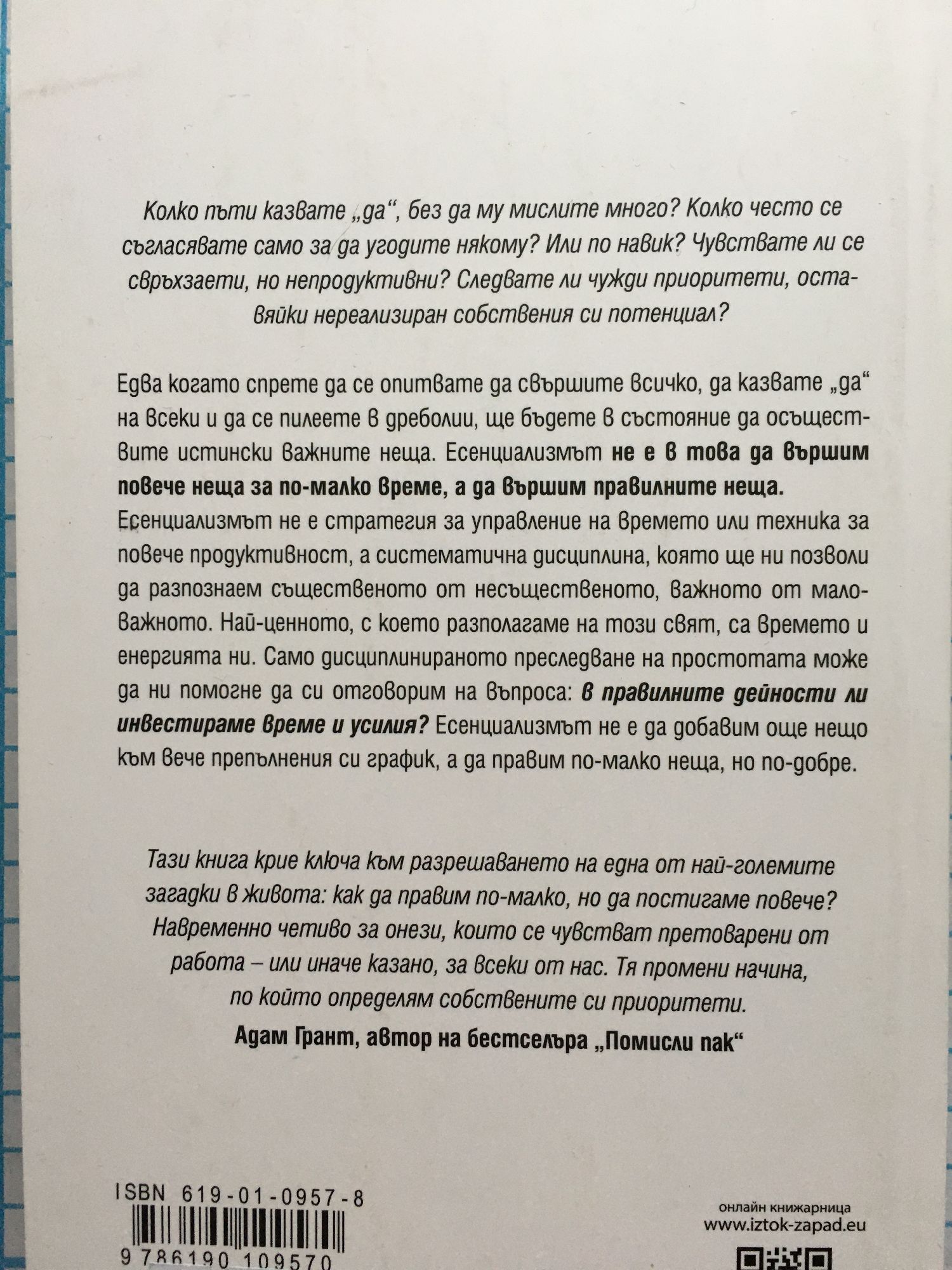 Колко пъти казвате „да“, без да му мислите много? Колко често се съгласявате само за да угодите някому? Или по навик? Чувствате ли се свръхзаети, но непродуктивни? Следвате ли чужди приоритети, оставяйки нереализиран собствения си потенциал? Едва когато спрете да се опитвате да свършите всичко, да казвате „да“ на всеки и да се пилеете в дреболии, ще бъдете в състояние да осъществите истински важните неща. Есенциализмът не е в това да вършим повече неща за по-малко време, а да вършим правилните неща. Есенциализмът не е стратегия за управление на времето или техника за повече продуктивност, а систематична дисциплина, която ще ни позволи да разпознаем същественото от несъщественото, важното от маловажното. Най-ценното, с което разполагаме на този свят, са времето и енергията ни. Само дисциплинираното преследване на простотата може да ни помогне да си отговорим на въпроса: в правилните дейности ли инвестираме време и усилия? Есенциализмът не е да добавим още нещо към вече препълнения си график, а да правим по-малко неща, но по-добре. Тази книга крие ключа към разрешаването на една от най-големите загадки в живота: как да правим по-малко, но да постигаме повече? Навременно четиво за онези, които се чувстват претоварени от работа – или иначе казано, за всеки от нас. Тя промени начина, по който определям собствените си приоритети.