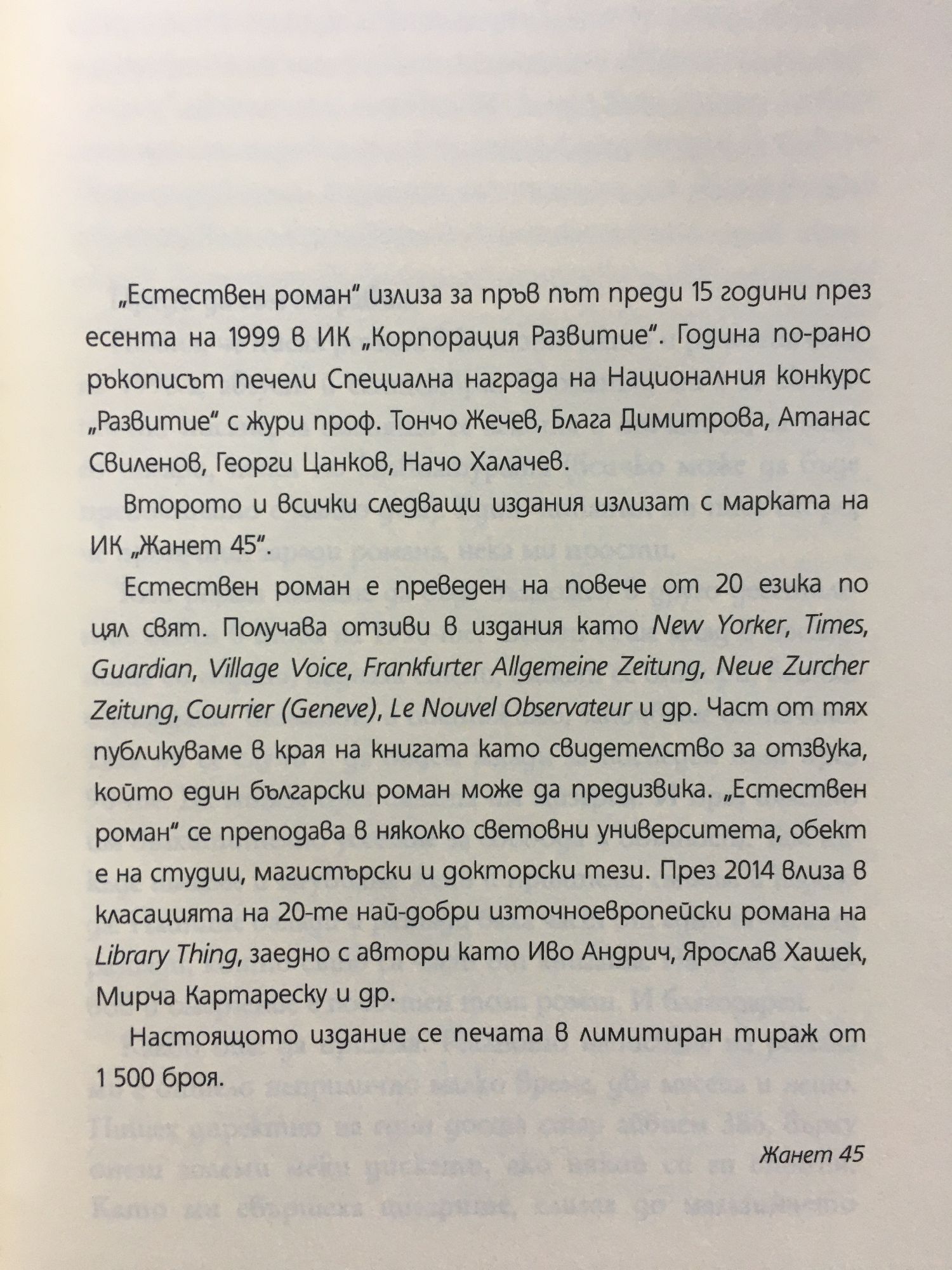 "Естествен роман", от излизането си през 1999 и досега, не е преставал да вълнува различни поколения читатели. В този смисъл той е „щастлива книга“, както пише в послеслова си Бойко Пенчев. Преведен е по цял свят на повече от 20 езика, с отзиви в Ню Йоркър, Таймс, Гардиън и други световни издания. Част от тях публикуваме в края на книгата като свидетелство за отзвука, който един български дебютен роман може да предизвика у нас и по света. „Естествен роман“ се преподава в няколко световни университета, обект е на студии, магистърски и докторски тези. През 2014-а влиза в класацията на 20-те най-добри източноевропейски романа на Library Things, заедно с автори като Иво Андрич, Ярослав Хашек, Мирча Картареску и др. Отдавна изчерпаното специално издание на романа, с предисловие от автора, надникване в тефтерите му, отзиви от България и света, с послеслов от Бойко Пенчев, библиография на преводите и др., излиза сега с малки промени и допълнения в трети лимитиран тираж.