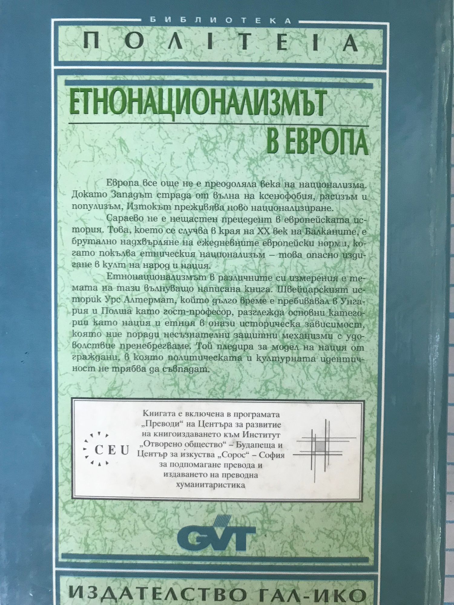 Европа все още не е преодоляла века на национализма. Докато Западът страда от вълна на ксенофобия, расизъм и популизъм, Изтокът преживява ново национализиране. Сараево не е нещастен прецедент в европейската история. Това, което се случва в края на XX век на Балканите, е брутално надхвърляне на ежедневните европейски норми, когато покълва етническия национализъм - това опасно издигане в култ на народ и нация. Етнонационализмът в различните си измерения е темата на тази вълнуващо написана книга. Швейцарският историк Урс Алтермат, който дълго време е пребивавал в Унгария и Полша като гост-професор, разглежда основни категории като нация и етния в онази историческа зависимост, която ние поради несъзнателни защитни механизми с удоволствие пренебрегваме. Той пледира за модел на нация от граждани, в която политическата и културната идентичност не трябва да съвпадат.