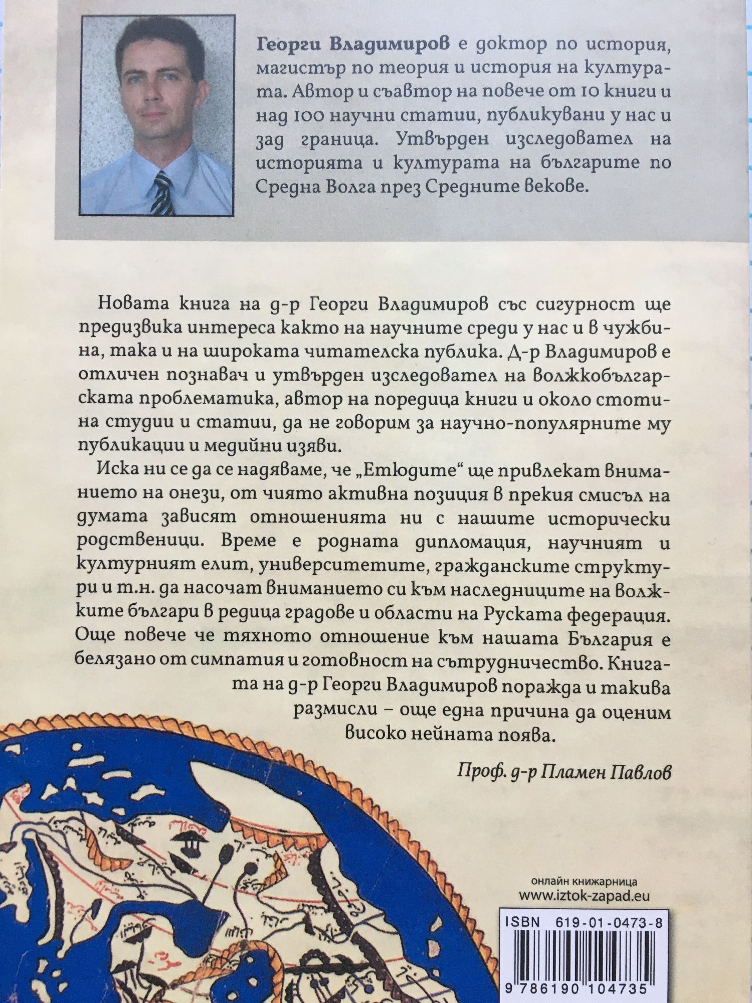 "Новата книга на д-р Георги Владимиров със сигурност ще предизвика интереса както на научните среди у нас и в чужбина, така и на широката читателска публика. Д-р Владимиров е отличен познавач и утвърден изследовател на волжкобългарската проблематика, автор на поредица книги и около стотина студии и статии, да не говорим за научно-популярните му публикации и медийни изяви. Иска ни се да се надяваме, че "Етюдите" ще привлекат вниманието на онези, от чиято активна позиция в прекия смисъл на думата зависят отношенията ни с нашите исторически родственици. Време е родната дипломация, научният и културният елит, университетите, гражданските структури и т.н. да насочат вниманието си към наследниците на волжките българи в редица градове и области на Руската федерация. Още повече че тяхното отношение към нашата България е белязано от симпатия и готовност на сътрудничество. Книгата на д-р Георги Владимиров поражда и такива размисли - още една причина да оценим високо нейната поява." Проф. д-р Пламен Павлов Георги Владимиров е доктор по история, магистър по теория и история на културата. Автор и съавтор на повече от 10 книги и над 100 научни статии, публикувани у нас и зад граница. Утвърден изследовател на историята и културата на българите по Средна Волга през Средните векове.