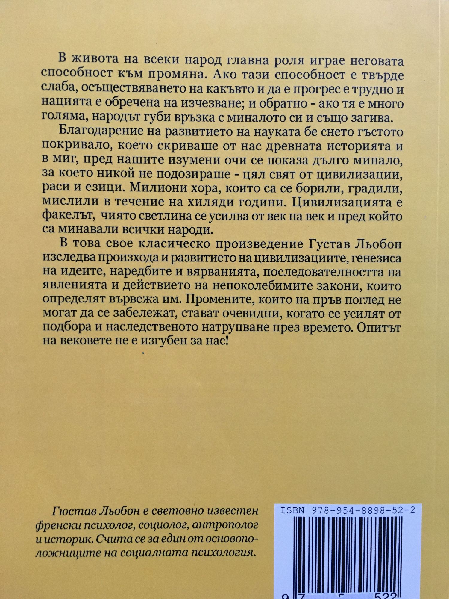 В живота на всеки народ главна роля играе неговата способност към промяна. Ако тази способност е твърде слаба, осъществяването на какъвто и да е прогрес е трудно и нацията е обречена на изчезване; и обратно - ако тя е много голяма, народът губи връзка с миналото си и също загива. Благодарение на развитието на науката бе снето гъстото покривало, което скриваше от нас древната историята и в миг, пред нашите изумени очи се показа дълго минало, за което никой не подозираше - цял свят от цивилизации, раси и езици. Милиони хора, които са се борили, градили, мислили в течение на хиляди години. Цивилизацията е факелът, чиято светлина се усилва от век на век и пред който са минавали всички народи. В това свое класическо произведение Густав Льобон изследва произхода и развитието на цивилизациите, генезиса на идеите, наредбите и вярванията, последователността на явленията и действието на непоколебимите закони, които определят вървежа им. Промените, които на пръв поглед не могат да се забележат, стават очевидни, когато се усилят от подбора и наследственото натрупване през времето. Опитът на вековете не е изгубен за нас!