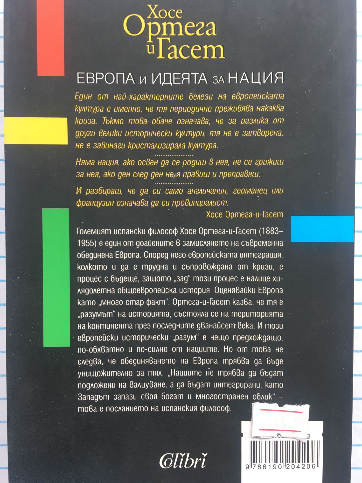 „Един от най-характерните белези на европейската култура е именно, че тя периодично преживява някаква криза. Тъкмо това обаче означава, че за разлика от други велики исторически култури, тя не е затворена, не е завинаги кристализирала култура. Няма нация, ако освен да се родиш в нея, не се грижиш за нея, ако ден след ден не я правиш и преправяш. И разбираш, че да си само англичанин, германец или французин означава да си провинциалист.“ Хосе Ортега-и-Гасет Големият испански философ Хосе Ортега-и-Гасет (1883–1955) е един от доайените в замислянето на съвременна обединена Европа. Според него европейската интеграция, колкото и да е трудна и съпровождана от кризи, е процес с бъдеще, защото „зад“ този процес е налице хилядолетна общоевропейска история. Оценявайки Европа като „много стар факт“, Ортега-и-Гасет казва, че тя е „разумът“ на историята, състояла се на територията на континента през последните дванадесет века. И този европейски исторически „разум“ е нещо предхождащо, по-обхватно и по-силно от нациите. Но от това не следва, че обединяването на Европа трябва да бъде унищожително за тях. „Нациите не трябва да бъдат подложени на валцуване, а да бъдат интегрирани, като Западът запази своя богат и многостранен облик“ – това е посланието на испанския философ.