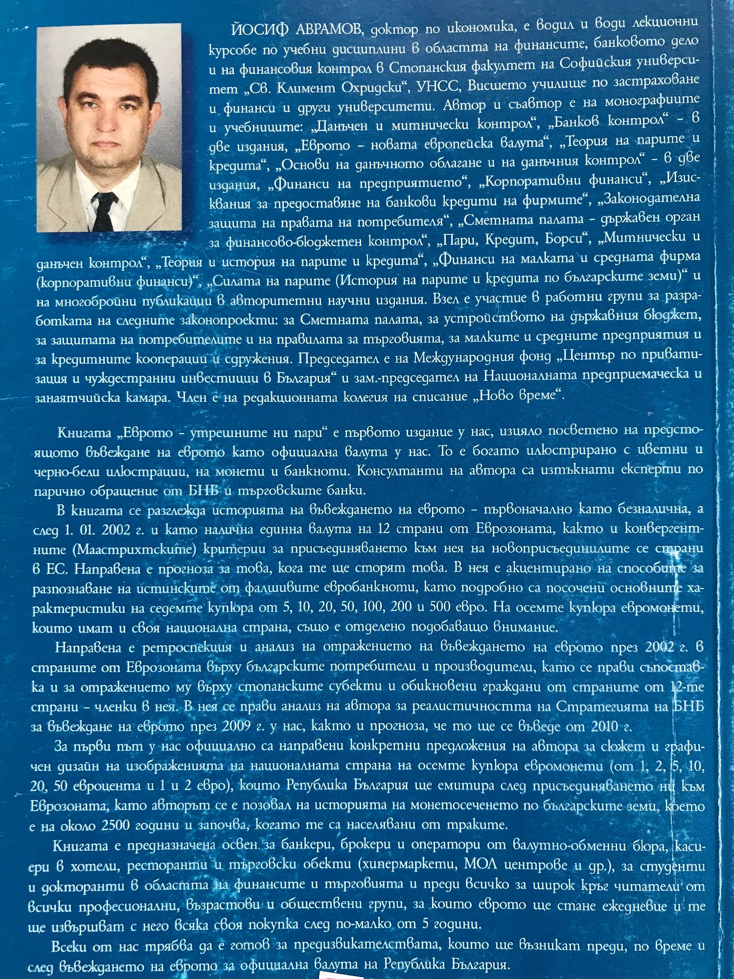 Книгата "Еврото - утрешните ни пари" е първото издание у нас, изцяло посветено на предстоящото въвеждане на еврото като официална валута у нас. То е богато илюстрирано с цветни и черно-бели илюстрации, на монети и банкноти. Консултанти на автора са изтъкнати експерти по парично обращение от БНБ и търговските банки. В книгата се разглежда историята на въвеждането на еврото - първоначално като безналична, а след 1. 01. 2002 г. и като налична единна валута на 12 страни от Еврозоната, както и конвергентните (Маастрихтските) критерии за присъединяването към нея на новоприсъединилите се страни в ЕС. Направена е прогноза за това, кога те ще сторят това. В нея е акцентирано на способите за разпознаване на истинските от фалшивите евробанкноти, като подробно са посочени основните характеристики на седемте купюра от 5, 10, 20, 50, 100, 200 и 500 евро. На осемте купюра евромонети, които имат и своя национална страна, също е отделено подобаващо внимание. Книгата е предназначена освен за банкери, брокери и оператори от валутно-обменни бюра, касиери в хотели, ресторанти и търговски обекти (хипермаркети, МОЛ центрове и др.), за студенти и докторанти в областта на финансите и търговията и преди всичко за широк кръг читатели от всички професионални, възрастови и обществени групи, за които еврото ще стане ежедневие и те ще извършват с него всяка своя покупка.