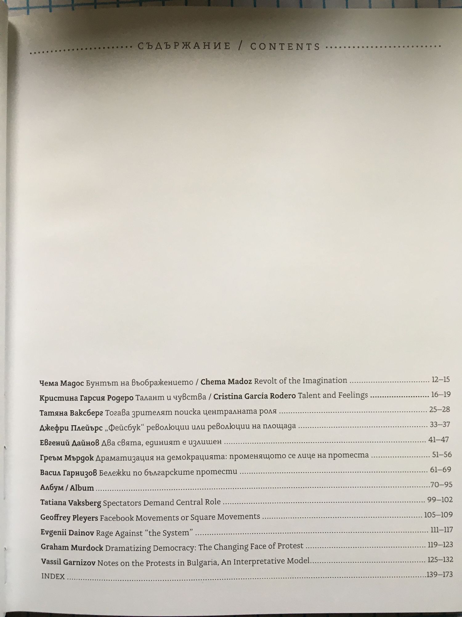 В тази книга са събрани есета, които разглеждат протеста и неговите състояния, социалните енергии на 21 век, и изследват общото между несъгласието преди и сега. Тук са включени най-силните фотографии, станали за малко част от софийския есенен пейзаж. В амбицията за космополитизиране и естетизиране на града се включиха някои от от най-големите майстори на фотографията в света - Кристина Гарсия Родеро и Чема Мадос - и най-големите световни агенции - Ройтерс, Франс Прес и ДПА, - които за първи път участват в общ проект. Техните кадри са диагноза за нашето днес и памет за нашето утре.