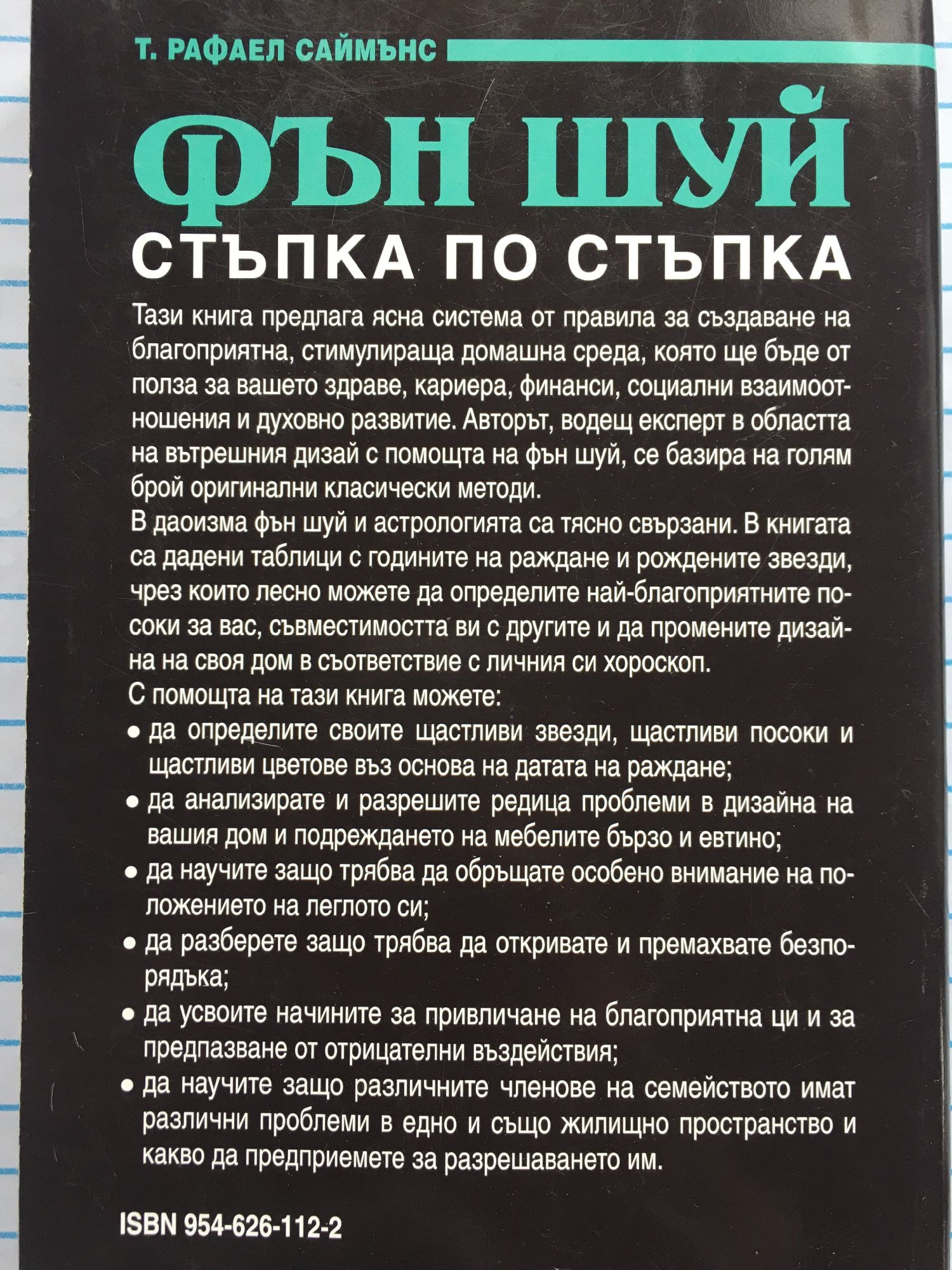 Тази книга предлага ясна система от правила за създаване на благоприятна, стимулираща домашна среда, която ще бъде от полза за вашето здраве, кариера, финанси, социални взаимоотношения и духовно развитие. Авторът, водещ експерт в областта на вътрешния дизайн с помощта на фън шуй, се базира на голям брой оригинални класически методи. В даоизма фън шуй и астрологията са тясно свързани. В книгата са дадени таблици с годините на раждане и рождените звезди, чрез които лесно можете да определите най-благоприятните посоки за вас, съвместимостта ви с другите и да промените дизайна на своя дом в съответствие с личния си хороскоп. С помощта на тази книга можете: - да определите своите щастливи звезди, щастливи посоки и щастливи цветове въз основа на датата на раждане; - да анализирате и разрешите редица проблеми в дизайна на вашия дом и подреждането на мебелите бързо и евтино; - да научите защо трябва да обръщате особено внимание на положението на леглото си; - да разберете защо трябва да откривате и премахвате безпорядъка; - да усвоите начините за привличане на благоприятна ци и за предпазване от отрицателни въздействия; - да научите защо различните членове на семейството имат различни проблеми в едно и също жилищно пространство и какво да предприемете за разрешаването им.