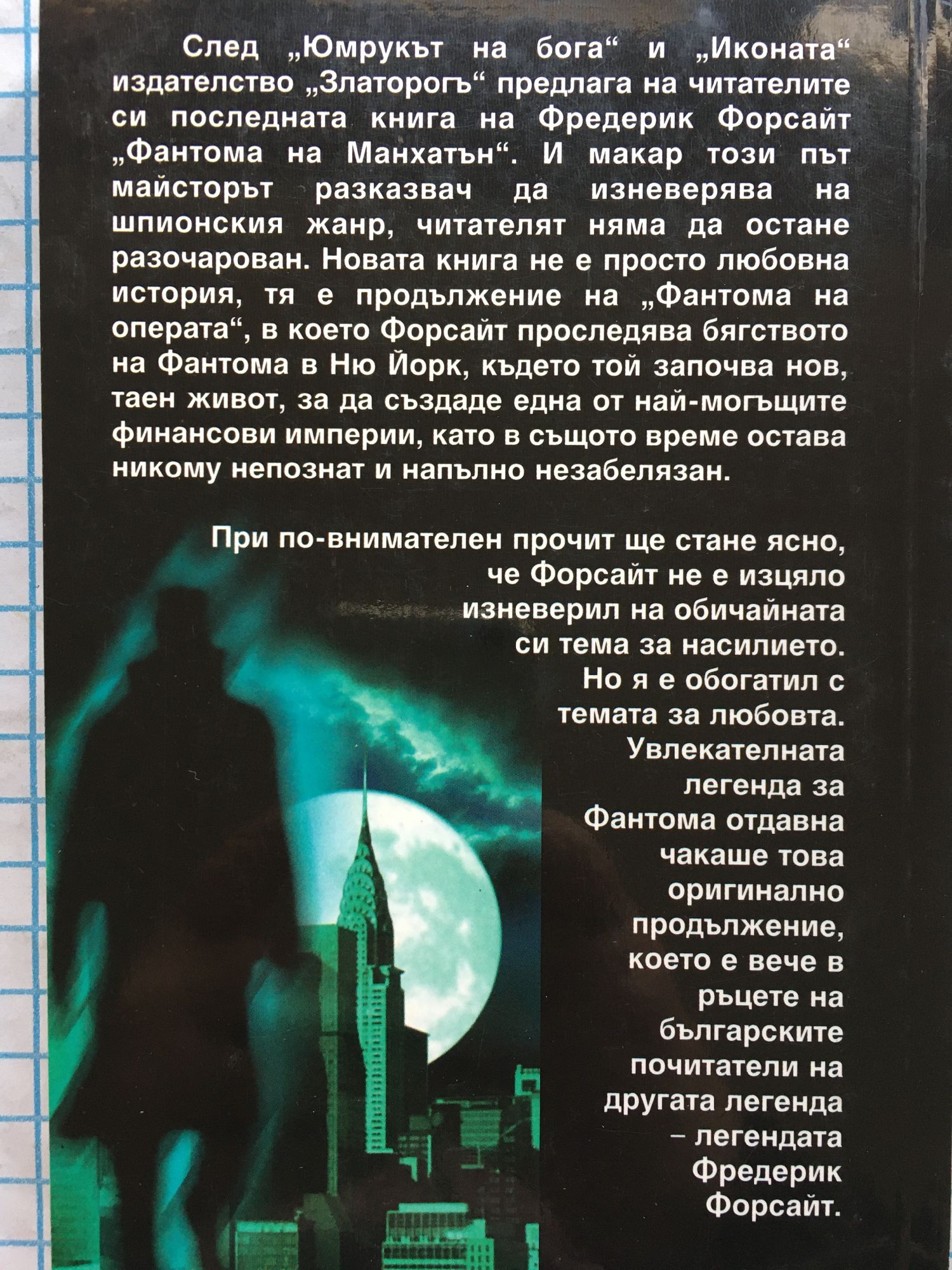 След "Юмрукът на бога" и "Иконата" издателство "Златорогъ" предлага на читателите си последната книга на Фредерик Форсайт "Фантома на Манхатън". И макар, че този път майсторът разказвач да изневерява на шпионския жанр, читателят няма да остане разочарован. Новата книга не е просто любовна история, тя е продължение на "Фантома на операта", в което Форсайт проследява бягството на Фантома в Ню Йорк, където той започва нов, таен живот, за да създаде една от най-могъщите финансови империи, като в същото време остава никому непознат и напълно незабелязан. При внимателен прочит ще стане ясно, че Форсайт не е изцяло изневерил на обичайната си тема за насилието. Но я е обогатил с темата за любовта. Увлекателната легенда за Фантома отдавна чакаше това оригинално продължение, което е вече в ръцете на българските почитатели на другата легенда-легендата Фредерик Форсайт.